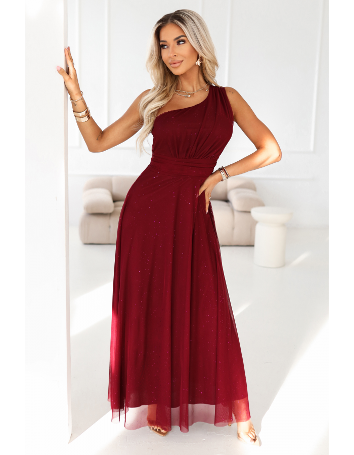 Elegancka bordowa suknia wieczorowa na jedno ramię z połyskiem. Polski producent Numoco. Odkryj kobiecy krój i zmysłowy styl na wyjątkowe okazje.
