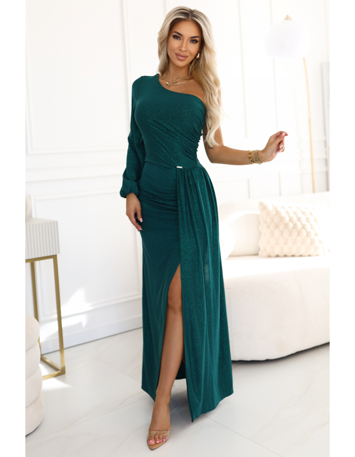 Długa zielona brokatowa asymetryczna sukienka na jedno ramię z rozcięciem - Numoco