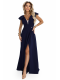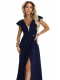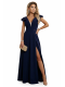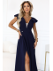 Elegancka granatowa sukienka maxi Numoco z dekoltem V, falbankowymi rękawkami i efektownym rozcięciem na nodze. Polska produkcja, idealna sukienka wieczorowa na wesele, uroczystości i wyjątkowe okazje.