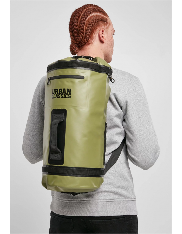 Tento hybrid batohu a batohu je dokonalým společníkem pro všechny outdoorové aktivity – dokonce i na vodě. Je vyrobena z vodoodpudivého PVC a lze ji přehodit pomocí dvou plátěných popruhů s nastavitelnou velikostí. Integrovaná rukojeť na zadní straně umožňuje přenášení jako běžnou tašku. Pro upevnění dalších zavazadel je k dispozici přidaný systém háčků, jakož i různé smyčky, kroužky a klipy, které jsou chytré a praktické možnosti. Batoh má také praktickou voděodolnou kapsu na zip a dvě průhledné síťované kapsy na přední straně. Na zadní straně je zdobena logem Urban Classics a pojme až tři litry.