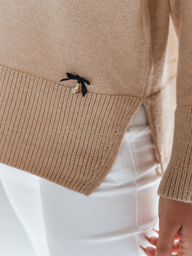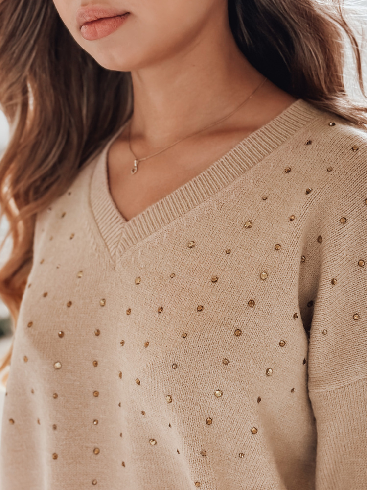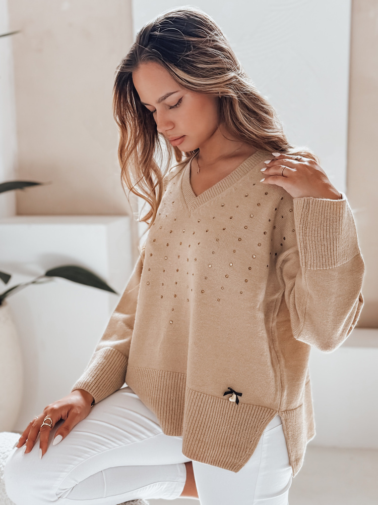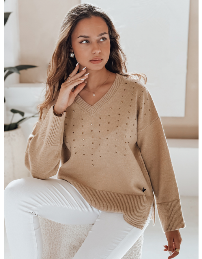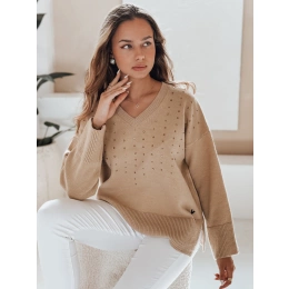 Damski sweter z dekoltem V VERALIA kamelowy