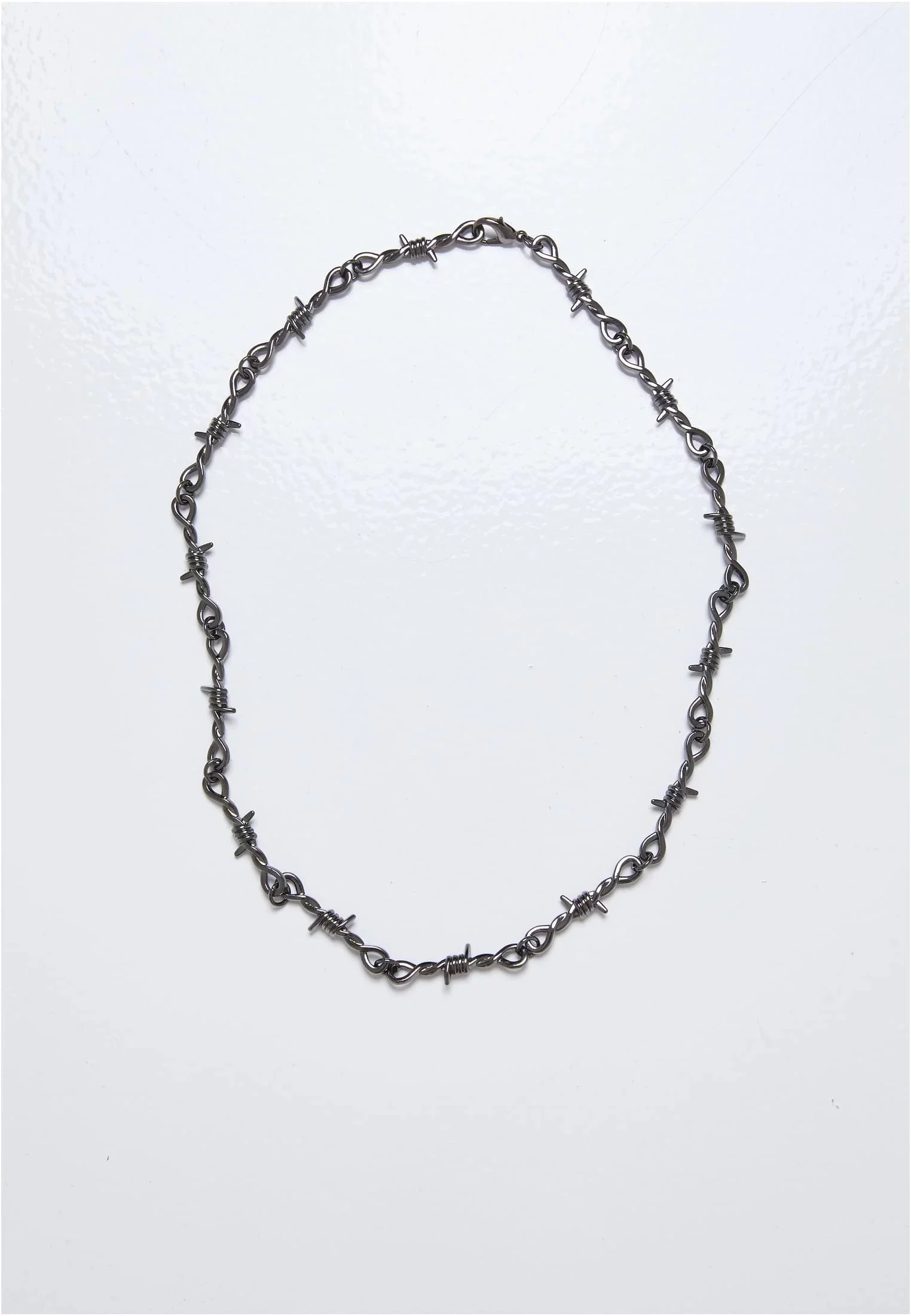 Ti, kteří se cítí pohodlněji se vzdáleností kolem sebe, najdou v tomto originálním náhrdelníku nezbytný doplněk. Jeho tvar jasně připomíná ostnatý drát, přičemž všechny prvky pohodlně leží na kůži. Náhrdelník je vyroben ze slitiny zinku a hodí se zejména k tmavým outfitům.