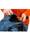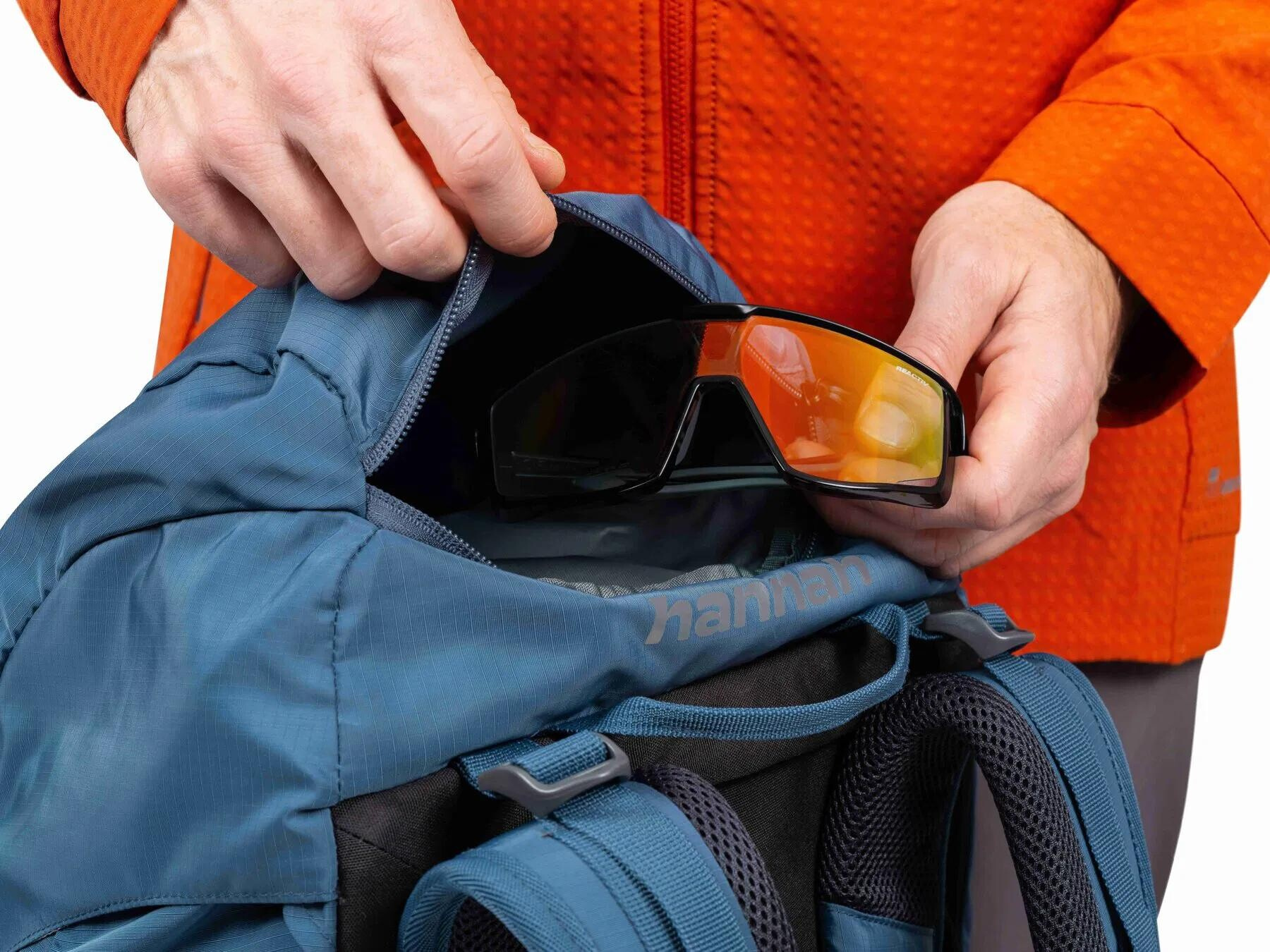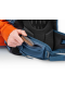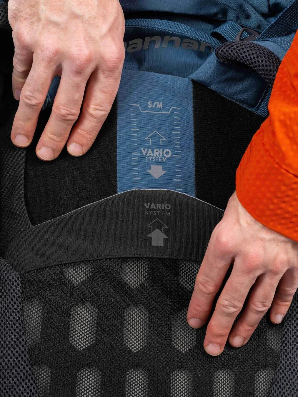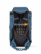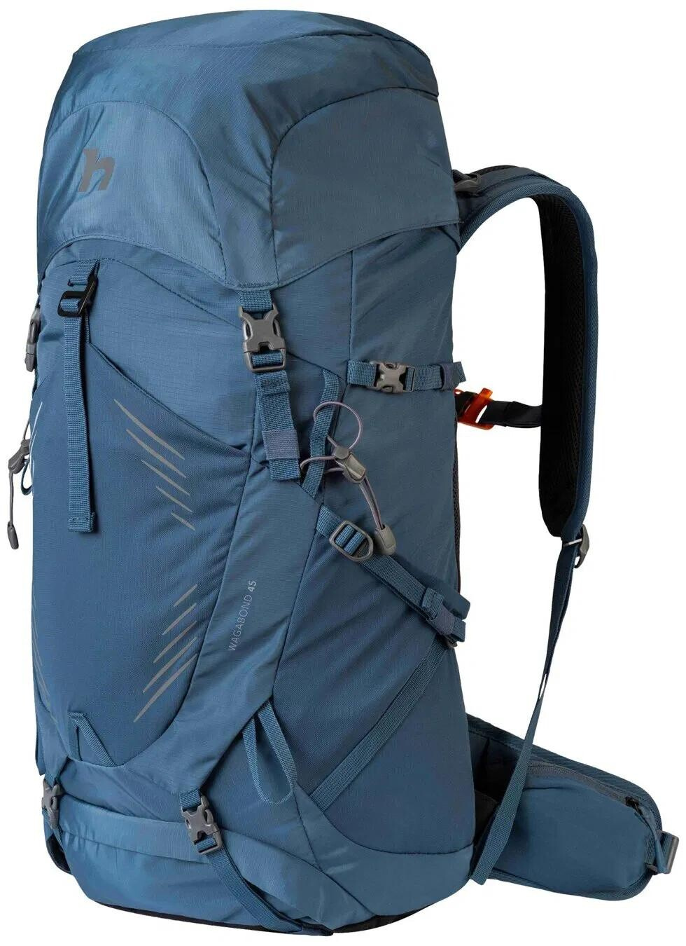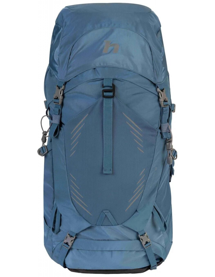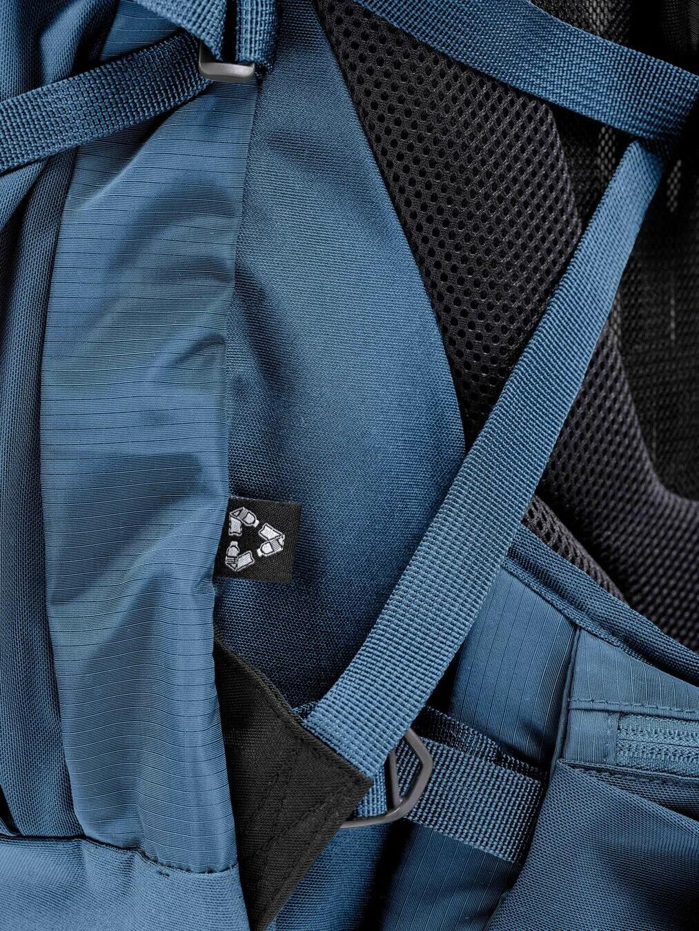 Dvoukomorový modrý turistický batoh 45 litrů je vyrobený z mechanicky odolného ripstop recyklovaného materiálu. Má horní a spodní vstup do hlavní komory. Posuvný zádový systém Vario na suchý zip lze přizpůsobit délce zad, stejně tak nastavitelné polstrované ramenní popruhy a bederní pás s kapsou. Zádový systém i ramenní popruhy jsou zároveň vyrobené z prodyšné a rychleschnoucí odolné síťoviny. V horní části ramen lze popruhem přitáhnout nebo povolit batoh, a tím i regulovat zatížení zad dle potřeb v terénu. Na hrudním popruhu, kterým zajistíte stabilitu ramenních popruhů, najdete pohotovostní píšťalku. Víko má vnitřní a vnější kapsu pro lepší rozčlenění drobných věcí na cestu. Nechybí úchyty na cepín nebo trekové hole či na jiný potřebný materiál. Dvě prostorné boční kapsy a přední síťovaná kapsa mohou sloužit pro rychlé odložení částí oblečení či drobností. Batoh lze jednoduše stáhnout bočními kompresními popruhy na menší objem. Nechybí integrovaná pláštěnka s reflexními prvky a kapsa na vodní rezervoár s vývodem. Batoh je vyroben z recyklovaného polyesteru (na výrobu jednoho kusu bylo zrecyklováno 21ks PET lahví o objemu 0,5l). Při výrobě tohoto produktu došlo tedy k významné úspoře energie a redukci uhlíkové stopy.