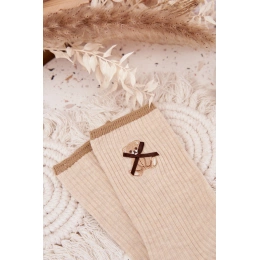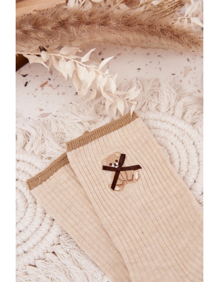 Stylové bavlněné ponožky v béžové barvě s jemným žebrováním a roztomilým motivem medvídka jsou ideální kombinací pohodlí a hravého designu. Měkký a prodyšný materiál zajišťuje komfort při každodenním nošení, zatímco neutrální odstín se snadno kombinuje s domácím i volnočasovým outfitem.