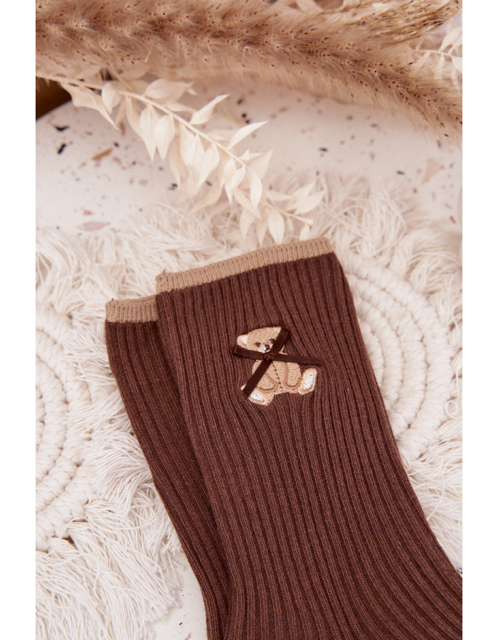 Bavlněné ponožky v žebrovaném provedení jsou příjemné na nošení a díky pružnému úpletu se dobře přizpůsobí noze. Motiv medvídka dodá ponožkám hravý a milý detail, který oživí každodenní outfit. Čokoládová barva působí teple a elegantně, takže se snadno kombinuje s neutrálními i přírodními odstíny a hodí se na nošení doma i venku.