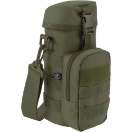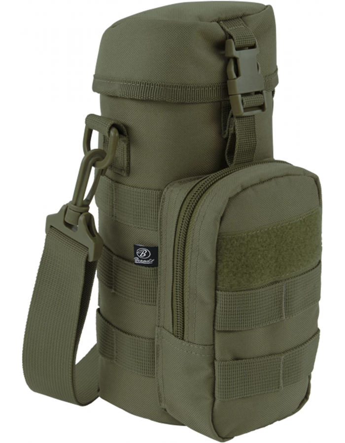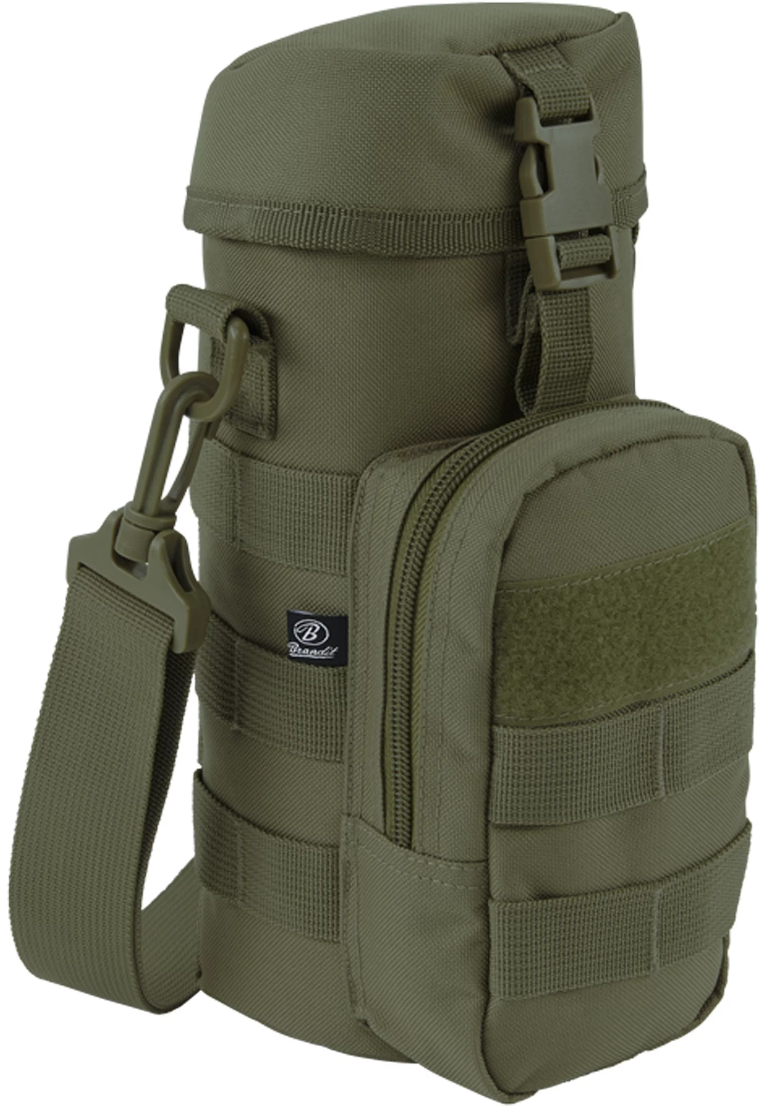 V praxi testovaný držák na láhev je vyroben s víkem a klipsovým uzávěrem, stejně jako s další vnější přihrádkou na zip a vnitřní síťovanou kapsou. Nastavitelný ramenní popruh držáku na láhev lze připnout na dva D-kroužky. Pevné povrchy na suchý zip umožňují připevnění dalších záplat a rozšíření upevňovacích smyček PALS pomocí systémů Molle. Funkce jsou zakončeny háček pro rychlé uvolnění klipu na zadní straně. Funkčně řešený držák na lahve je vyroben pro lahve o průměru do 9 cm s objemem od půl do jednoho litru. Decentní štítek s logem Brandit na boku doplňuje vojenský styl.