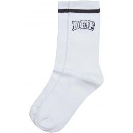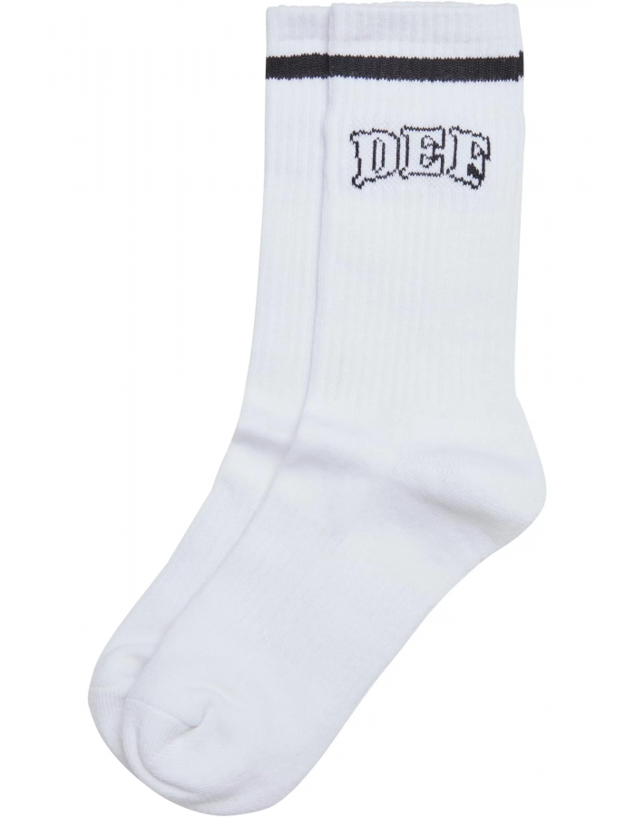 V horní části ponožek je černý pruh a pod ním nápis "DEF" ve stylizovaném černém písmu. Ponožky mají klasickou délku a jsou vyrobeny z pružného materiálu, který zajišťuje pohodlí při nošení. Tento styl ponožek je univerzální a hodí se jak pro každodenní nošení, tak pro sportovní aktivity.