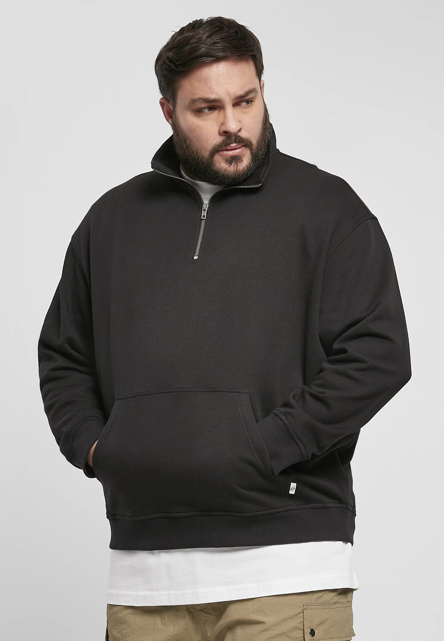 Skromný pánský svetr uspokojí nadčasovým designem a měkkou froté tkaninou z organické bavlny. Představuje se stojáčkem, dlouhým zipem a útulnou klokaní kapsou, kterou zdobí štítek s vlajkou. Funkční styl pánského dresu završují široké žebrované manžety na rukávech a lemu. Střih je pravidelný.