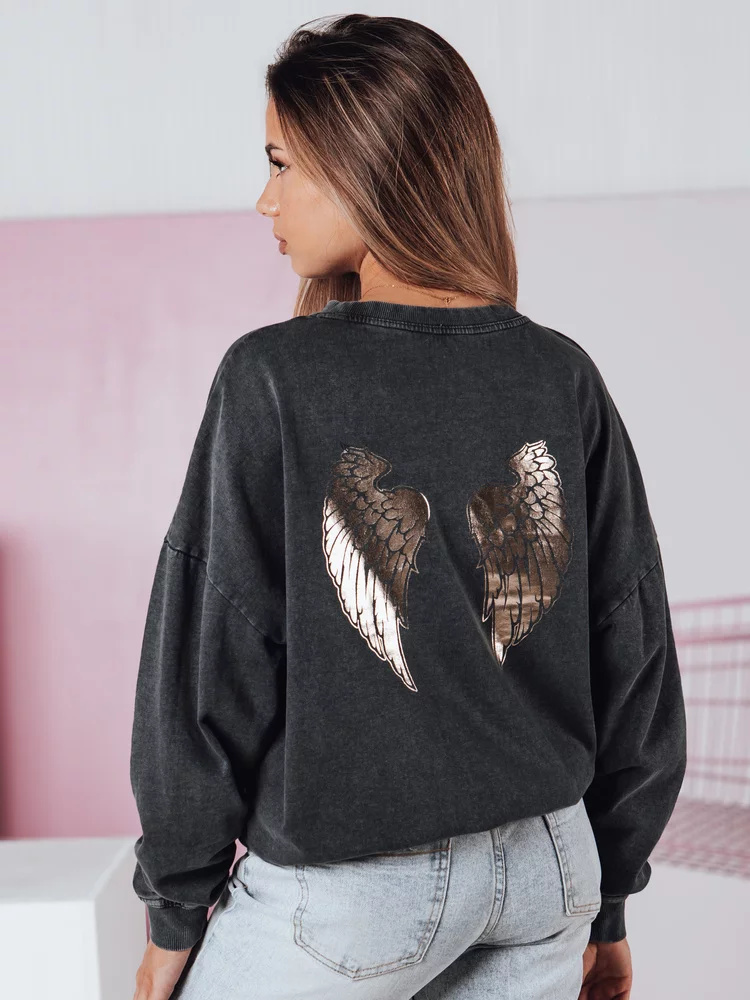 Stylowa bluza o luźnym kroju oversize z efektownym nadrukiem skrzydeł. Model ten jest wykończony ściągaczami. Miękka tkanina i subtelne detale czynią ją idealnym wyborem na co dzień. Uniwersalny rozmiar pasuje na rozmairy od XS do L. Połącz ją z jeansami, aby uzyskać modny, casualowy wygląd, lub zestaw z legginsami dla pełnego komfortu.