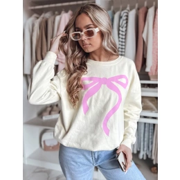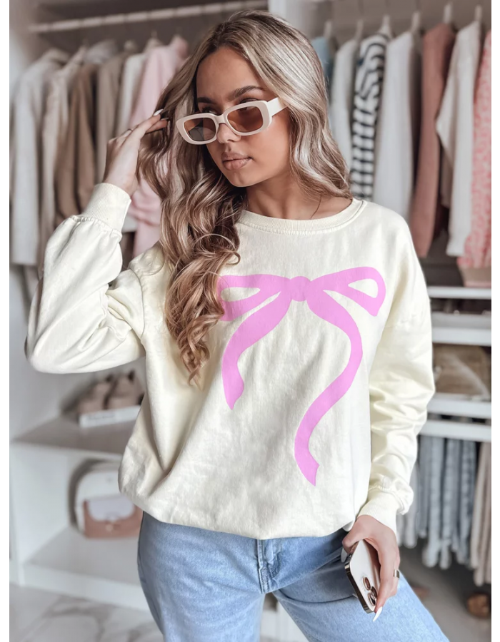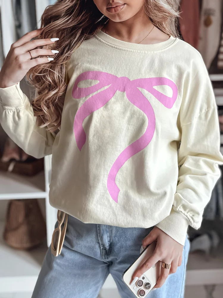 Bluza damska oversize z uroczym nadrukiem kokardy, która dodaje dziewczęcego uroku każdej stylizacji. Wykonana z miękkiej, oddychającej tkaniny, zapewnia komfort noszenia przez cały dzień. Klasyczny krój z okrągłym dekoltem i ściągaczami na rękawach sprawia, że idealnie układa się na sylwetce. Uniwersalny rozmiar pasuje od XS do L. Doskonała na codzienne wyjścia.
