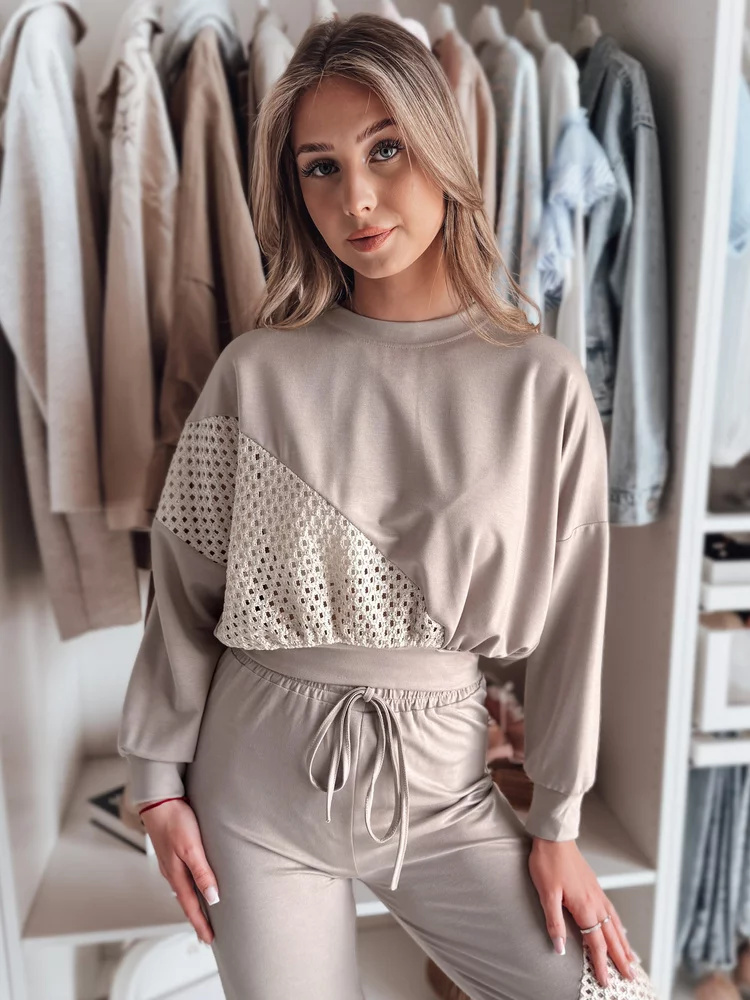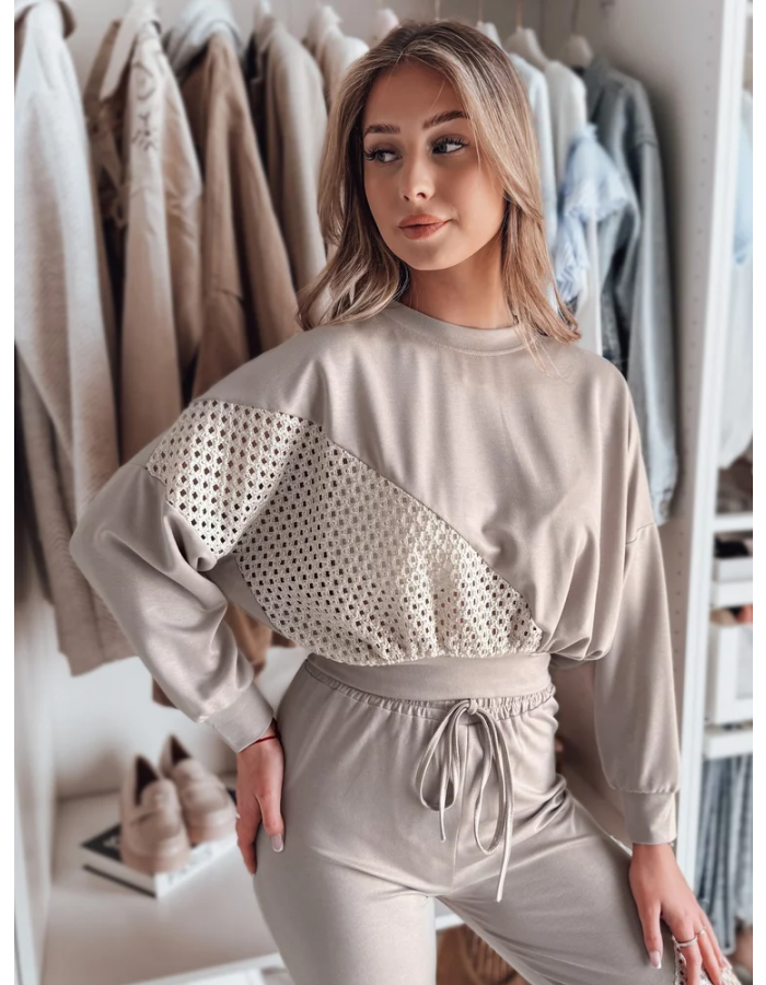 Minimalistyczna Bluza z nowoczesnym akcentem – ozdobna wstawka z ażurowej tkaniny przyciąga uwagę i dodaje całości lekkości. Wygodny fason zapewnia swobodę ruchów, dzięki czemu model ten sprawdzi się zarówno na co dzień, jak i w bardziej eleganckich zestawieniach.