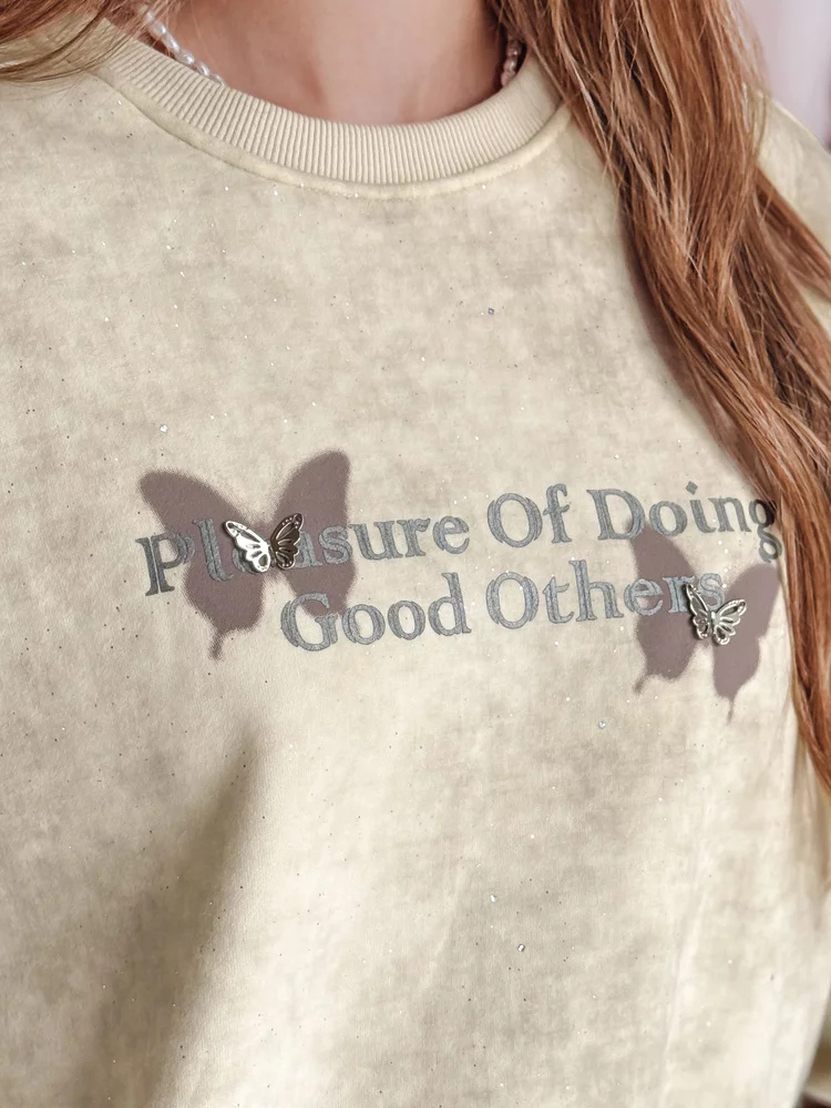 Damska bluza oversize z motywem tie-dye to idealne połączenie wygody i stylu. Ozdobny nadruk z motylkami oraz brokatowe wstawki na całości bluzy nadają jej subtelnego, kobiecego charakteru. Efekt 3D uzyskany dzięki naszywanym motylom sprawia, że bluza prezentuje się niezwykle modnie. Uniwersalny rozmiar pasuje od XS do L. To idealna propozycja dla miłośniczek casualowych stylizacji, doskonale komponuje się z jeansami, jak i legginsami, tworząc stylowy look na co dzień.