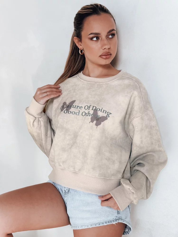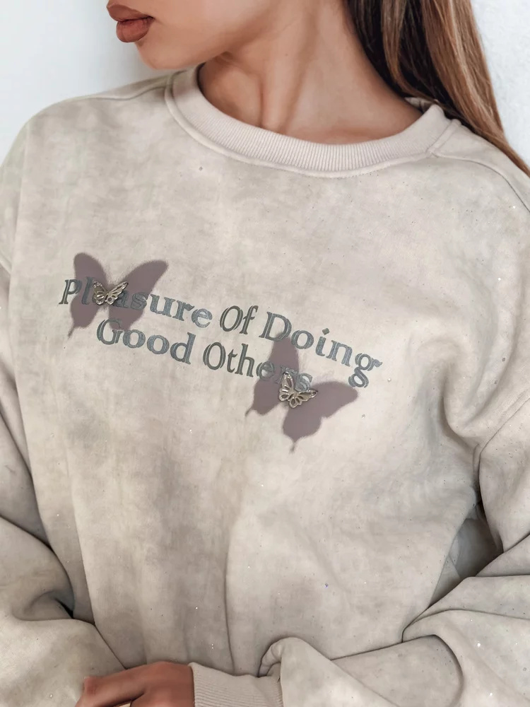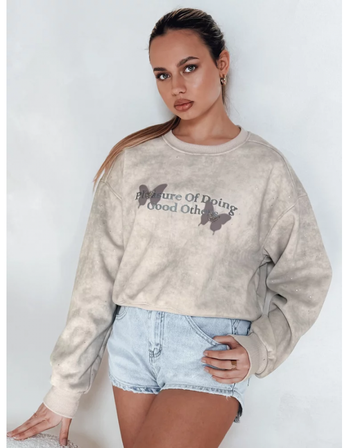 Damska bluza oversize z motywem tie-dye to idealne połączenie wygody i stylu. Ozdobny nadruk z motylkami oraz brokatowe wstawki na całości bluzy nadają jej subtelnego, kobiecego charakteru. Efekt 3D uzyskany dzięki naszywanym motylom sprawia, że bluza prezentuje się niezwykle modnie. Uniwersalny rozmiar pasuje od XS do L. To idealna propozycja dla miłośniczek casualowych stylizacji, doskonale komponuje się z jeansami, jak i legginsami, tworząc stylowy look na co dzień.