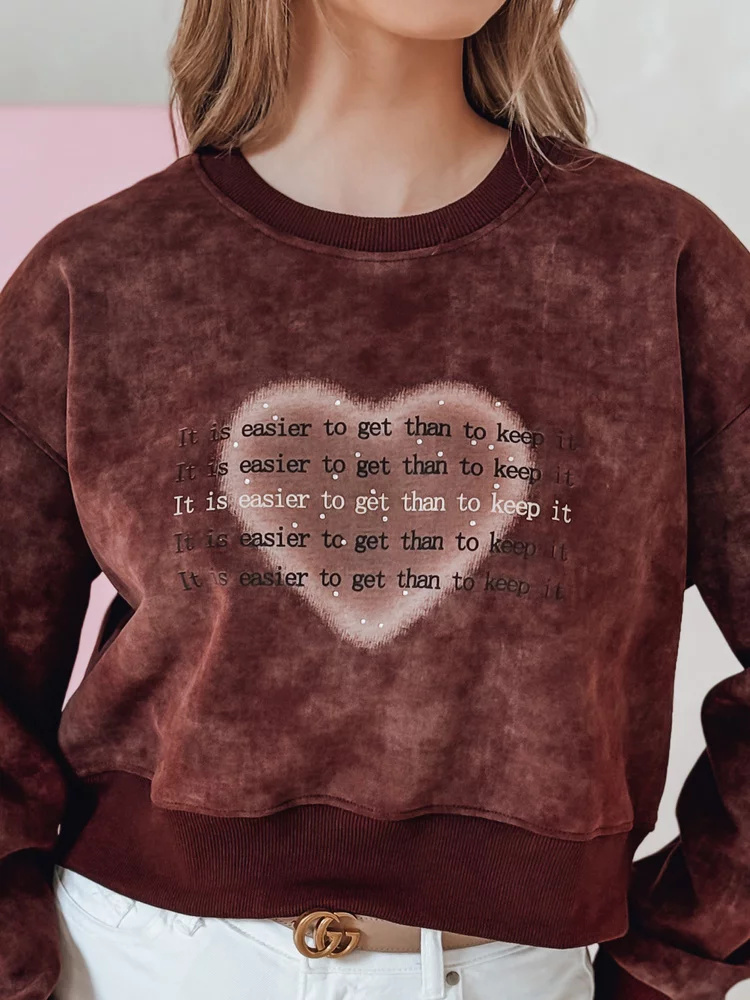 Bluza damska oversize o unikalnym efekcie tie-dye, idealna na codzienne stylizacje. Wygodny krój i elastyczne ściągacze zapewniają komfort noszenia, a nadruk z napisami oraz sercem dodaje oryginalnego charakteru. Model wkładany przez głowę, świetnie komponuje się z jeansami i sneakersami, tworząc idealną podstawę do casualowego look'u.