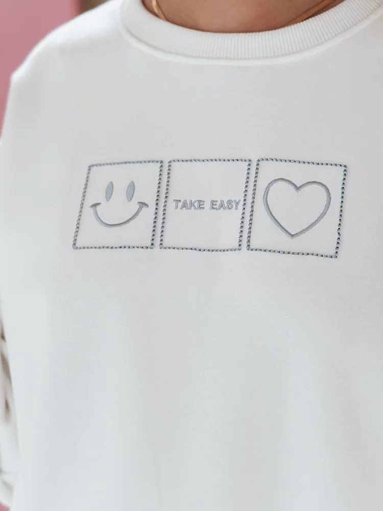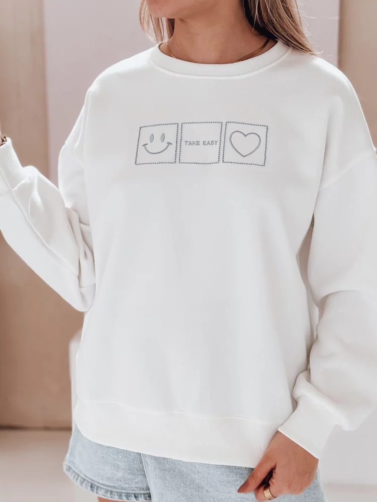 Bluza damska oversize z haftowanymi motywami, w tym uśmiechem, sercem i napisem „TAKE EASY”. Wygodna, wkładana przez głowę, z okrągłym dekoltem i ściągaczami przy rękawach oraz na dole. Uniwersalny rozmiar pasuje od XS do L. Miękki materiał zapewnia komfort noszenia na co dzień. Idealna propozycja na wiosenne dni, kiedy liczy się luz i styl w jednym.