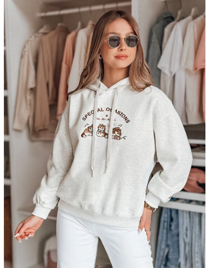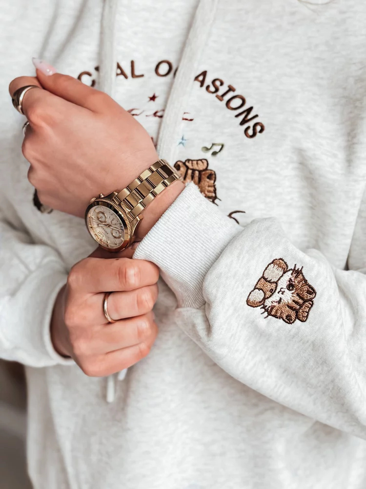 Bluza damska oversize z kapturem to połączenie wygody i stylu, które doskonale wpisuje się w wiosenne stylizacje. Uniwersalny rozmiar pasuje od XS do L. Uwagę przyciąga efektowny haft z uroczymi kotkami oraz napisem "SPECIAL OCASIONS", który dodaje całości dziewczęcego uroku. Haft pojawia się również na rękawie, co tworzy spójny detal. Kaptur regulowany sznurkiem, ściągacze przy rękawach i na dole bluzy podkreślają jej casualowy charakter. Świetnie sprawdzi się w codziennym wydaniu.