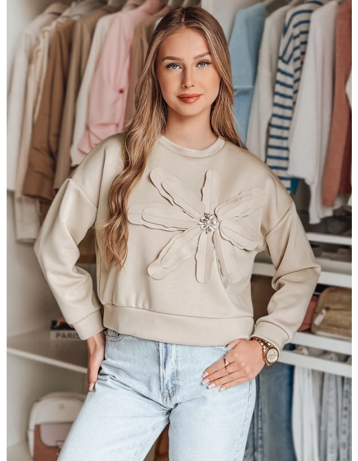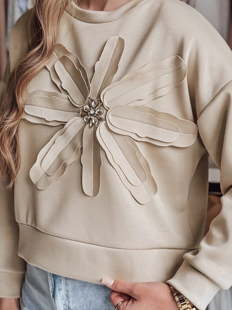 Bluza damska w kroju oversize, wyróżniająca się przestrzenną aplikacją w kształcie kwiatu z połyskującymi cyrkoniami. Uniwersalny rozmiar pasuje od XS do L. Minimalistyczny design łączy się z efektownymi detalami, tworząc nietuzinkowy element garderoby. Świetna do jeansów i spodni materiałowych.