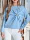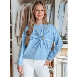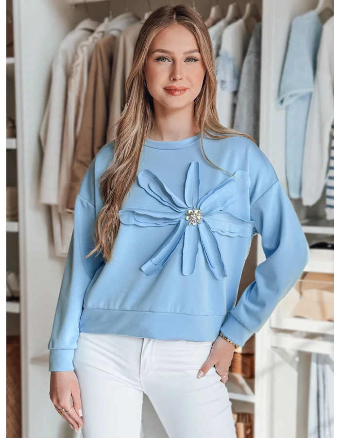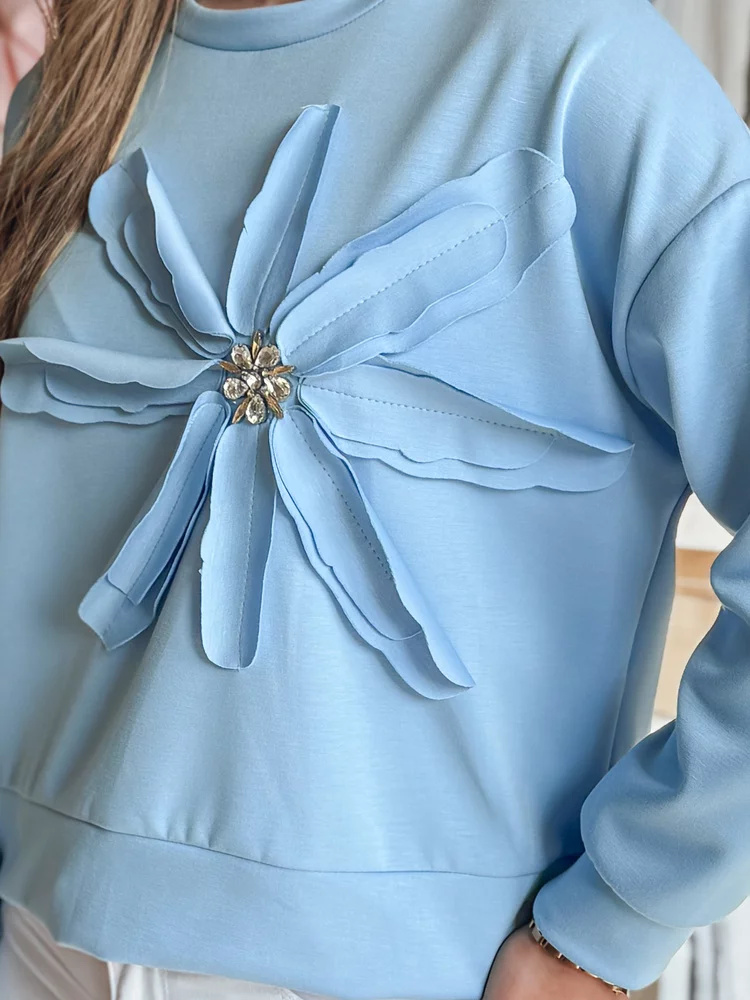 Bluza damska w kroju oversize, wyróżniająca się przestrzenną aplikacją w kształcie kwiatu z połyskującymi cyrkoniami. Uniwersalny rozmiar pasuje od XS do L. Minimalistyczny design łączy się z efektownymi detalami, tworząc nietuzinkowy element garderoby. Świetna do jeansów i spodni materiałowych.