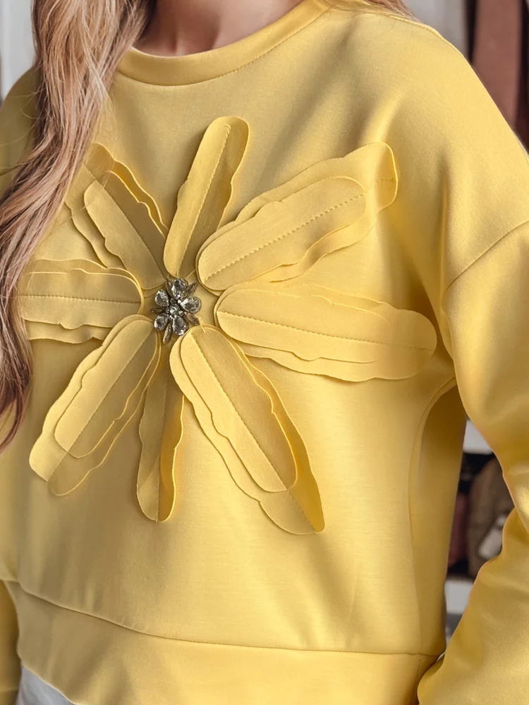 Bluza damska w kroju oversize, wyróżniająca się przestrzenną aplikacją w kształcie kwiatu z połyskującymi cyrkoniami. Uniwersalny rozmiar pasuje od XS do L. Minimalistyczny design łączy się z efektownymi detalami, tworząc nietuzinkowy element garderoby. Świetna do jeansów i spodni materiałowych.