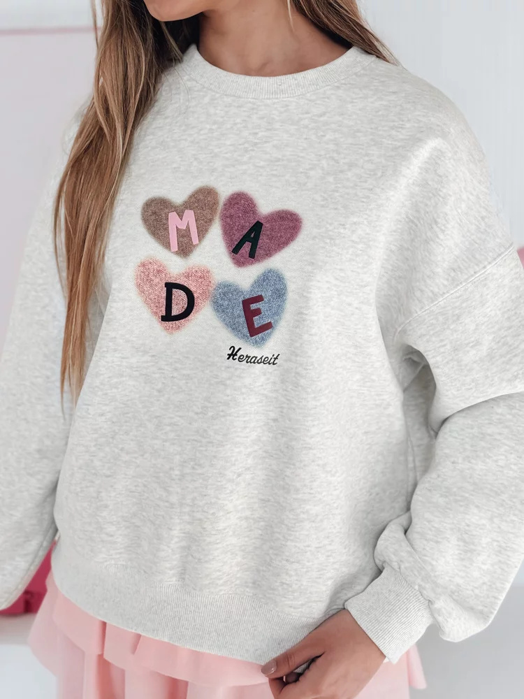 Bluza damska oversize o luźnym kroju, który gwarantuje wygodę na co dzień. Wykonana z miękkiego materiału premium, który delikatnie otula skórę. Na przodzie uroczy nadruk w kształcie serc z literami oraz subtelny napis "Heraseit". Uniwersalny rozmiar pasuje od XS do L. Ściągacze przy rękawach i na dole zapewniają komfort noszenia i idealne dopasowanie. Bluza idalna na okres przejściowy do casualowych zestawów.