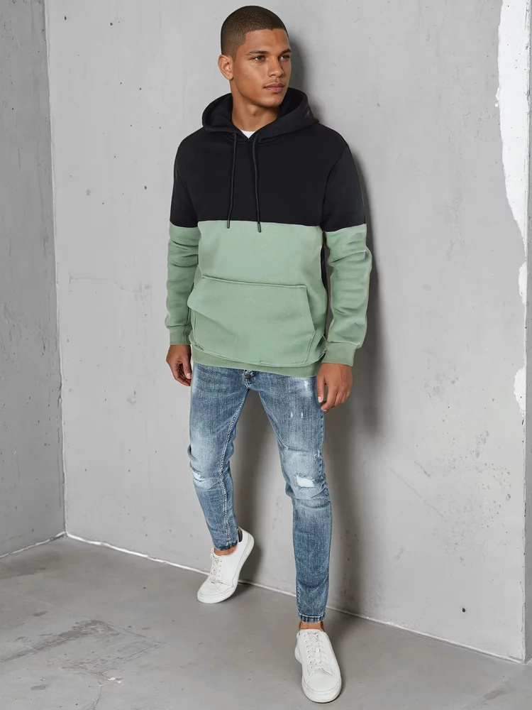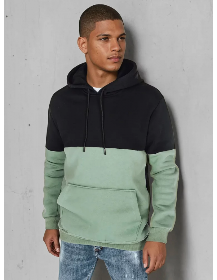 Stylowa bluza męska z modnym połączeniem kolorów i wygodnym kapturem. Regulacja sznurkiem umożliwia dopasowanie, a kieszeń kangurka zapewnia wygode. Ściągacze na rękawach i dole podkreślają casualowy charakter. Idealna opcja na co dzień, pasująca zarówno do jeansów, jak i sportowych stylizacji.
