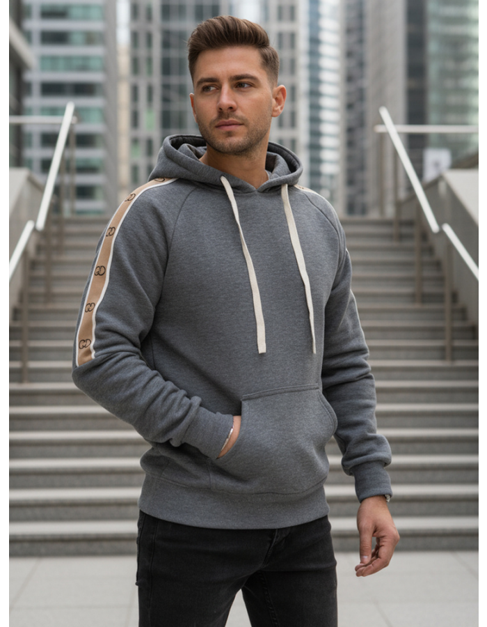 Wygodna bluza męska o sportowym kroju sprawdzi się w codziennych stylizacjach i aktywnościach na świeżym powietrzu. Miękki materiał zapewnia komfort noszenia, a klasyczny fason pozostaje uniwersalny przez cały rok. Regulowany kaptur zwiększa funkcjonalność, natomiast kontrastowe taśmy na rękawach nadają jej nowoczesnego i wyrazistego charakteru.