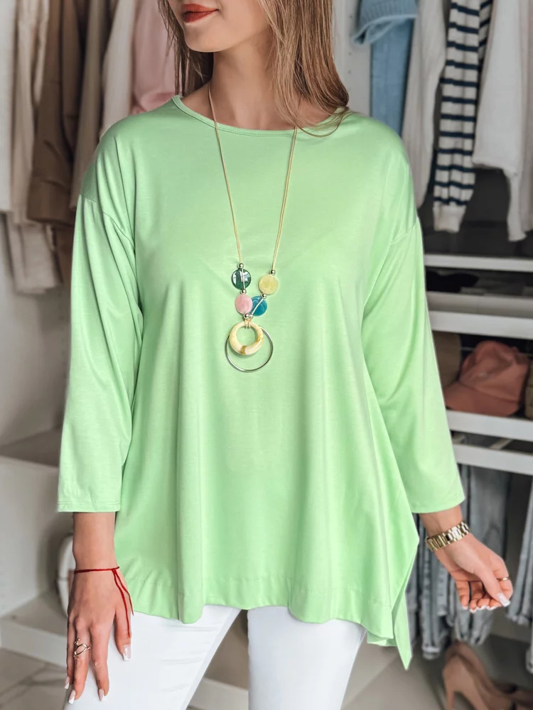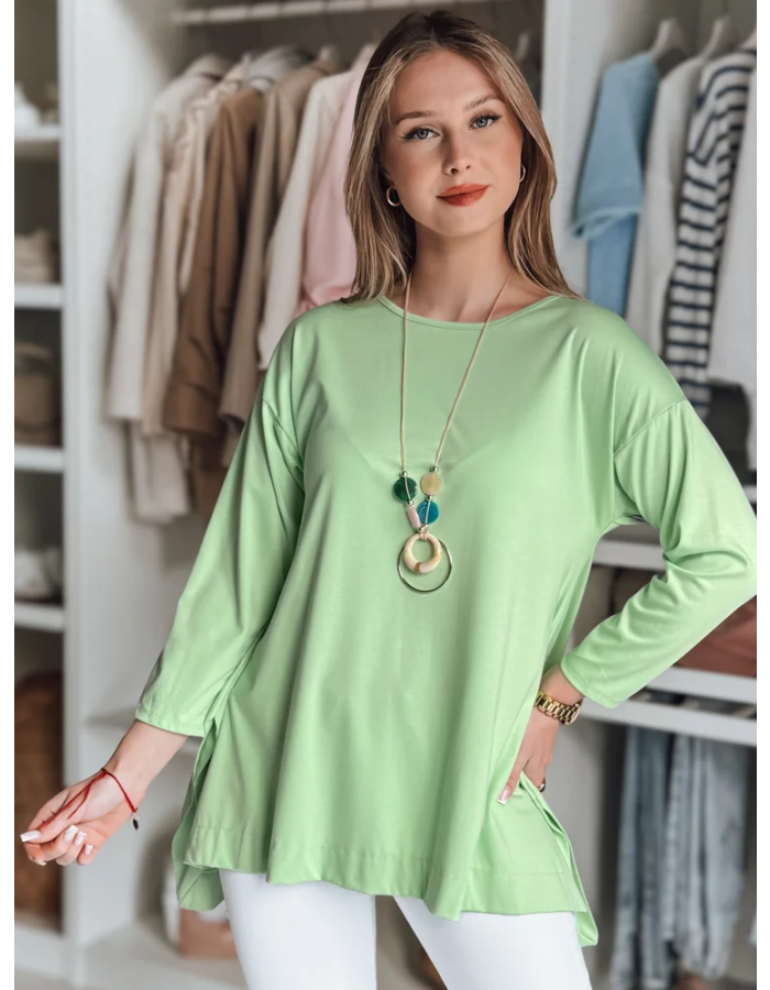 Bluzka damska oversize o luźnym, swobodnym kroju, który zapewnia pełen komfort noszenia. Wykonana z miękkiego materiału, idealnie układa się na sylwetce. Uniwersalny rozmiar pasuje od XS do L. Rozcięcia po bokach oraz wydłużony tył nadają jej modny wygląd. W zestawie stylowy wisiorek, który dopełnia całość. Must-have dla miłośniczek wygody!