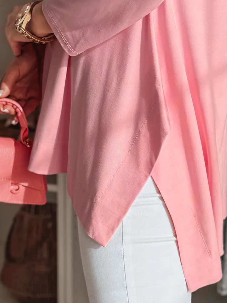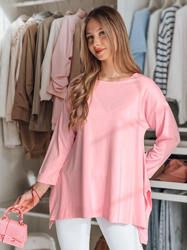 Bluzka damska oversize o luźnym, swobodnym kroju, który zapewnia pełen komfort noszenia. Wykonana z miękkiego materiału, idealnie układa się na sylwetce. Uniwersalny rozmiar pasuje od XS do L. Rozcięcia po bokach oraz wydłużony tył nadają jej modny wygląd. W zestawie stylowy wisiorek, który dopełnia całość. Must-have dla miłośniczek wygody!