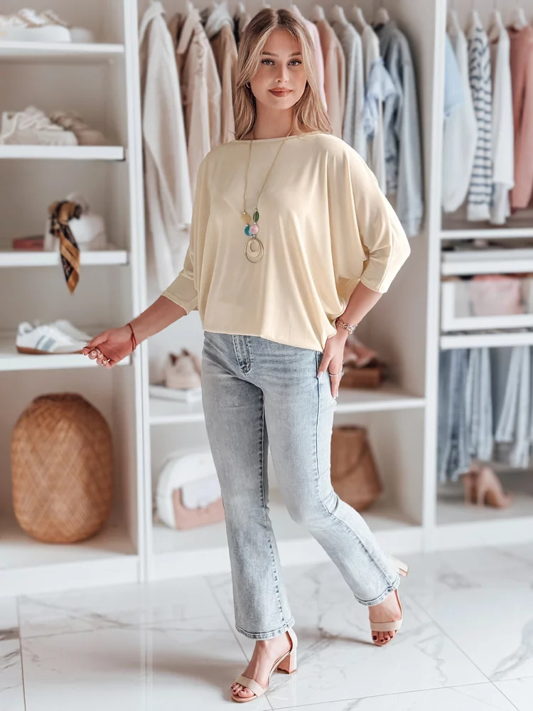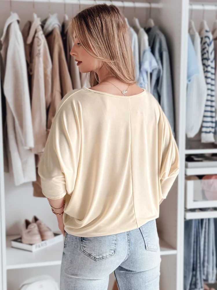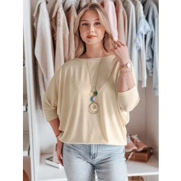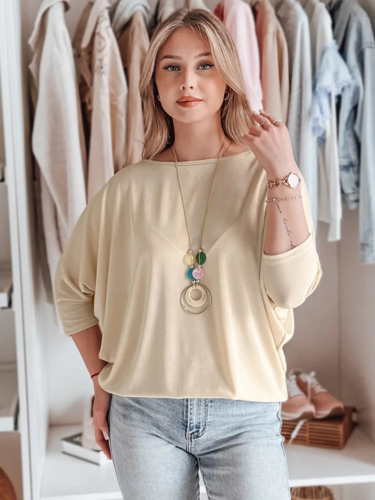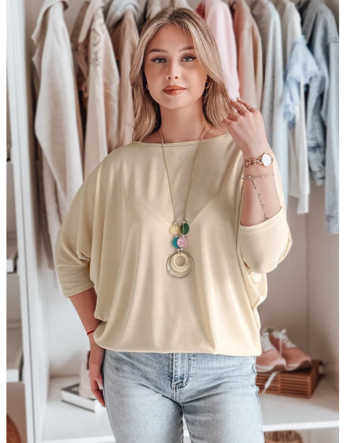 Stylowa bluzka o luźnym kroju oversize, wykonana z lekkiego materiału, który pięknie układa się na sylwetce. Rękawy 3/4 zakończone dopasowanymi mankietami podkreślają nowoczesny design, a delikatny wisiorek w komplecie stanowi wyjątkowy dodatek. Idealna do jeansów, spódnic i eleganckich spodni.