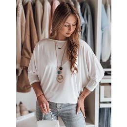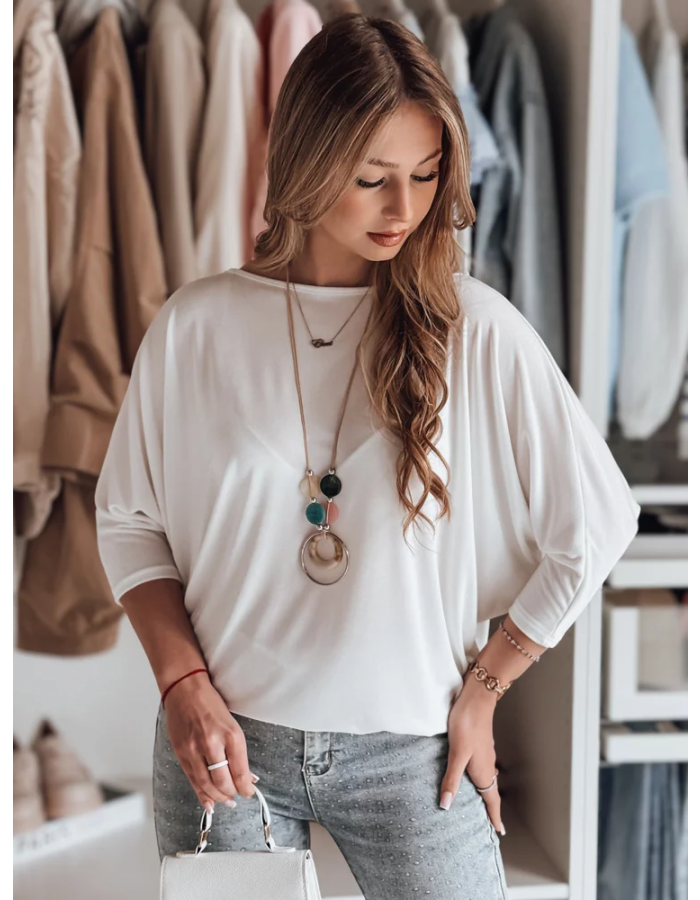 Stylowa bluzka o luźnym kroju oversize, wykonana z lekkiego materiału, który pięknie układa się na sylwetce. Rękawy 3/4 zakończone dopasowanymi mankietami podkreślają nowoczesny design, a delikatny wisiorek w komplecie stanowi wyjątkowy dodatek. Idealna do jeansów, spódnic i eleganckich spodni.