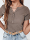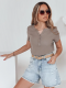 Bluzka damska z krótkim rękawem i dekoracyjnym rozpinanym dekoltem to połączenie stylu oraz wygody. Uszyta z elastycznego, prążkowanego materiału, zapewnia komfort noszenia przez cały dzień. Guziki z przodu tworzą modny akcent, który świetnie podkręca klasyczne stylizacje. Uniwersalny rozmiar pasuje od XS do L. Model idealny na wiosnę i lato, świetnie wygląda z jeansami lub spódnicami.