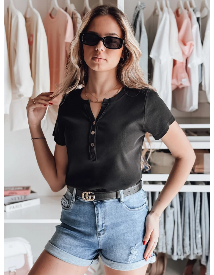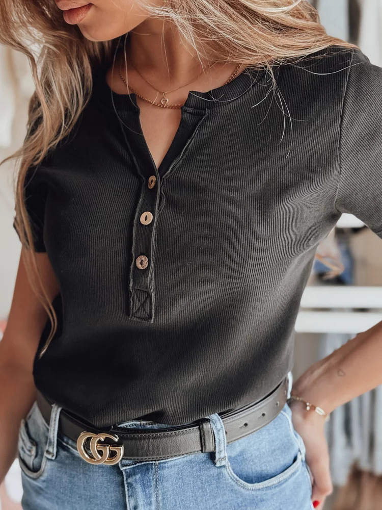 Bluzka damska z krótkim rękawem i dekoracyjnym rozpinanym dekoltem to połączenie stylu oraz wygody. Uszyta z elastycznego, prążkowanego materiału, zapewnia komfort noszenia przez cały dzień. Guziki z przodu tworzą modny akcent, który świetnie podkręca klasyczne stylizacje. Uniwersalny rozmiar pasuje od XS do L. Model idealny na wiosnę i lato, świetnie wygląda z jeansami lub spódnicami.