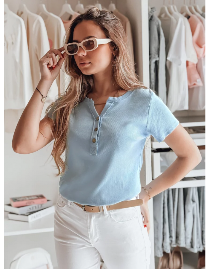Bluzka damska z krótkim rękawem i dekoracyjnym rozpinanym dekoltem to połączenie stylu oraz wygody. Uszyta z elastycznego, prążkowanego materiału, zapewnia komfort noszenia przez cały dzień. Guziki z przodu tworzą modny akcent, który świetnie podkręca klasyczne stylizacje. Uniwersalny rozmiar pasuje od XS do L. Model idealny na wiosnę i lato, świetnie wygląda z jeansami lub spódnicami.