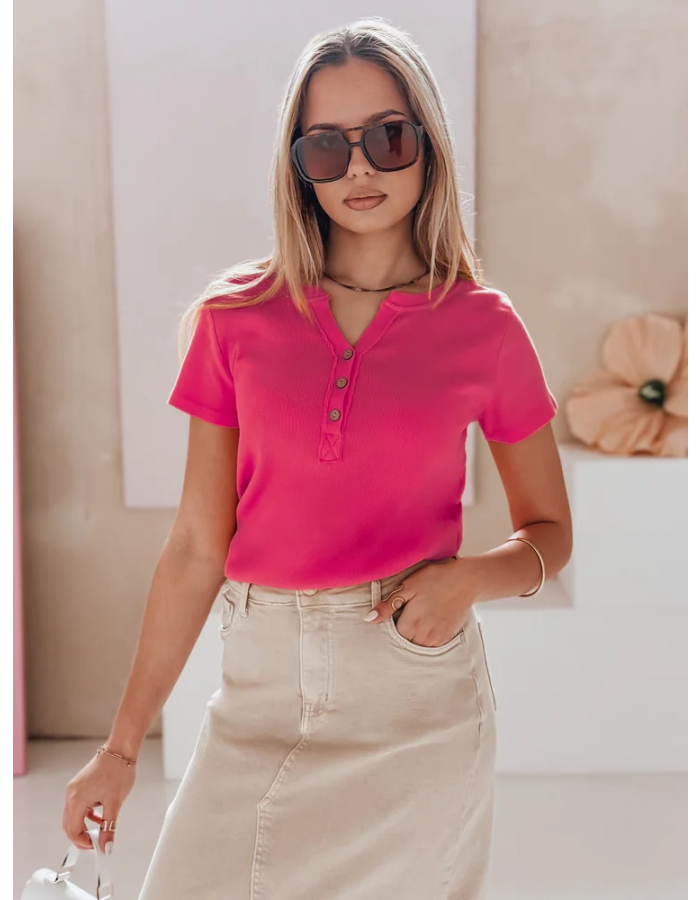 Bluzka damska z krótkim rękawem i dekoracyjnym rozpinanym dekoltem to połączenie stylu oraz wygody. Uszyta z elastycznego, prążkowanego materiału, zapewnia komfort noszenia przez cały dzień. Guziki z przodu tworzą modny akcent, który świetnie podkręca klasyczne stylizacje. Uniwersalny rozmiar pasuje od XS do L. Model idealny na wiosnę i lato, świetnie wygląda z jeansami lub spódnicami.
