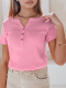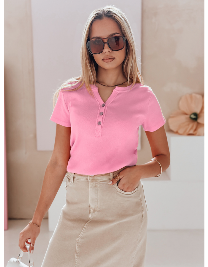 Bluzka damska z krótkim rękawem i dekoracyjnym rozpinanym dekoltem to połączenie stylu oraz wygody. Uszyta z elastycznego, prążkowanego materiału, zapewnia komfort noszenia przez cały dzień. Guziki z przodu tworzą modny akcent, który świetnie podkręca klasyczne stylizacje. Uniwersalny rozmiar pasuje od XS do L. Model idealny na wiosnę i lato, świetnie wygląda z jeansami lub spódnicami.
