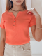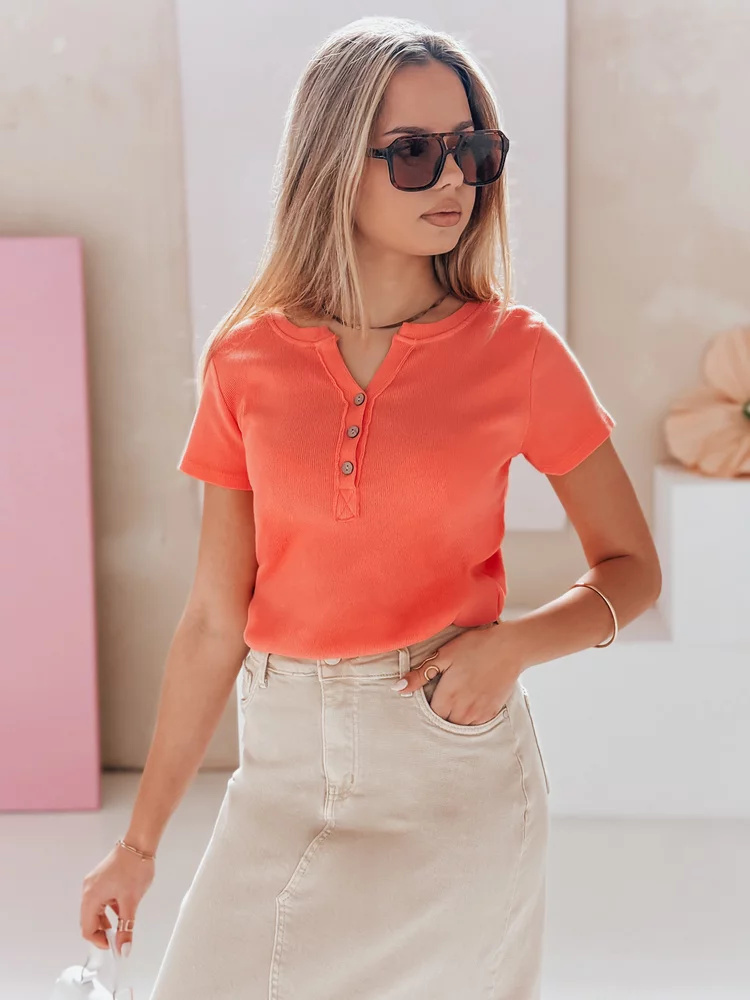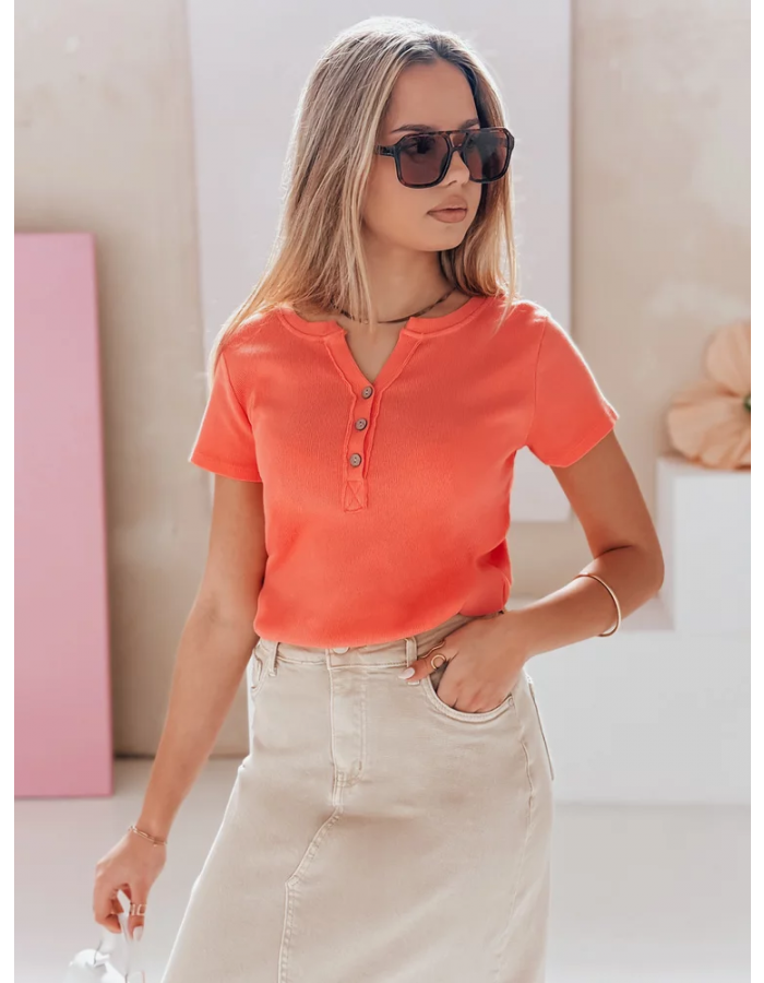 Bluzka damska z krótkim rękawem i dekoracyjnym rozpinanym dekoltem to połączenie stylu oraz wygody. Uszyta z elastycznego, prążkowanego materiału, zapewnia komfort noszenia przez cały dzień. Guziki z przodu tworzą modny akcent, który świetnie podkręca klasyczne stylizacje. Uniwersalny rozmiar pasuje od XS do L. Model idealny na wiosnę i lato, świetnie wygląda z jeansami lub spódnicami.