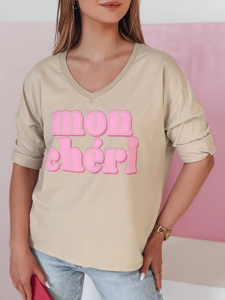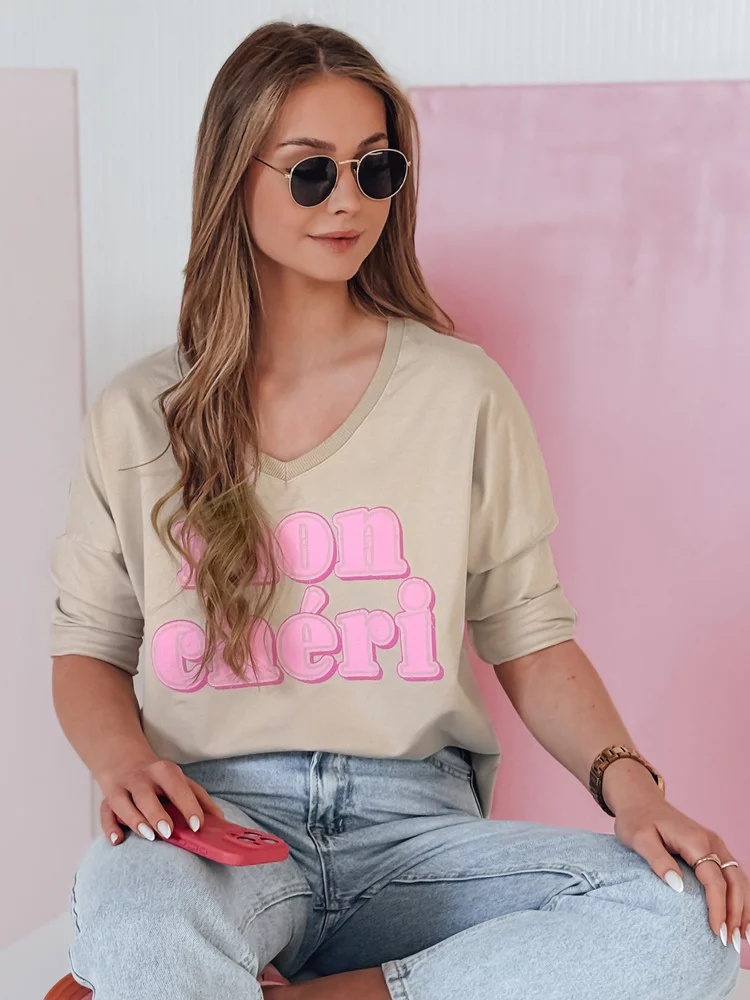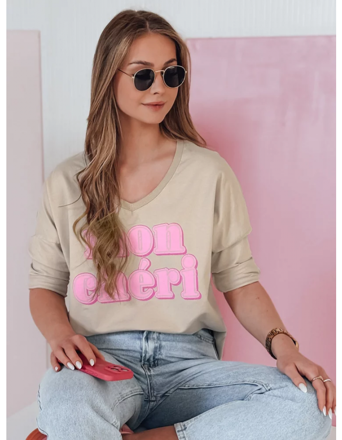 Bluzka oversize z wyjątkowym nadrukiem "Mon Chéri" to idealny wybór dla kobiet ceniących sobie wygodę i modny wygląd. Uniwersalny rozmiar pasuje od XS do L. Dekolt w serek delikatnie wydłuża szyję, a luźny fason pasuje do różnych typów sylwetki. Dzięki uniwersalnemu krojowi bluzkę można nosić na wiele sposobów – włożoną do spodni lub wypuszczoną na wierzch dla bardziej swobodnego efektu. Doskonale sprawdzi się w codziennych stylizacjach, tworząc modny look.
