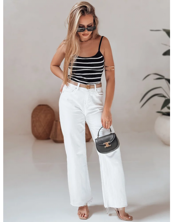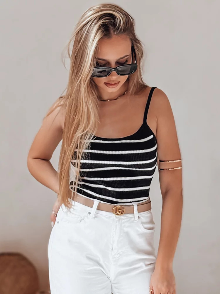 Prążkowane body damskie na cienkich ramiączkach to wygodna i stylowa propozycja na cieplejsze dni. Wzór w poziome paski optycznie modeluje sylwetkę. Głębokie wycięcie na plecach to subtelny akcent, który dodaje całości zmysłowości. Uniwersalny rozmiar pasuje od XS do L. Idealne na wiosenne dni i letnie stylizacje – zarówno na co dzień, jak i w wersji bardziej wakacyjnej.