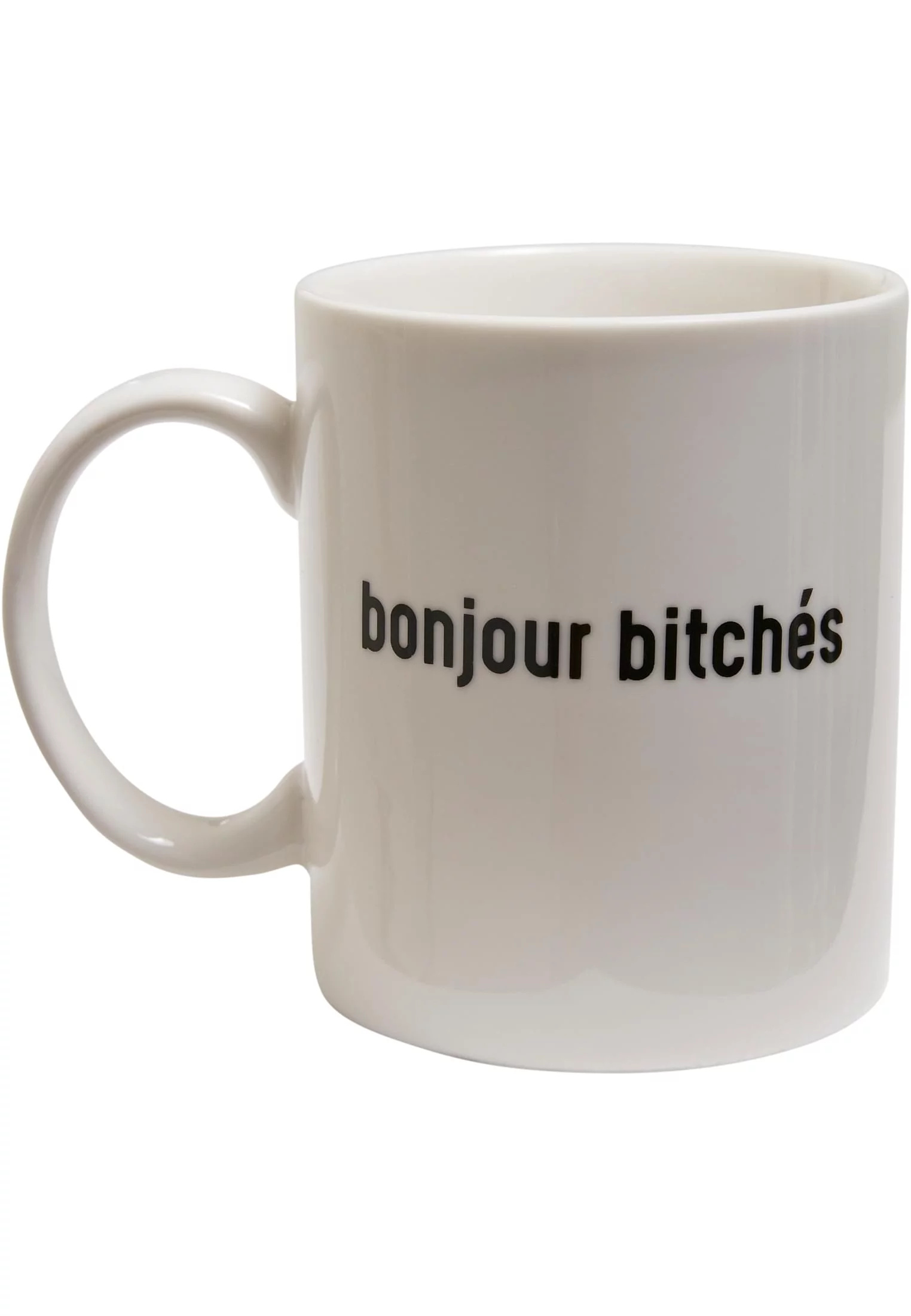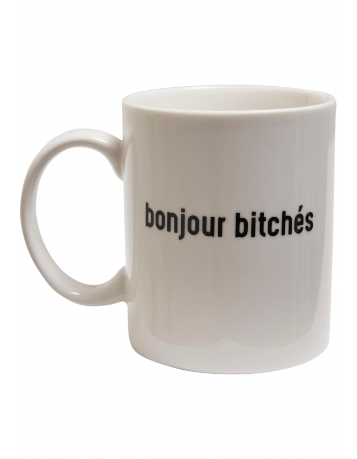 Tento nápadný šálek kávy nese poutavý nápis „bonjour bitchés“. Dále je na spodní straně ozdobené velké červené srdce. Je vyrobena z keramiky a nabízí velkou rukojeť.