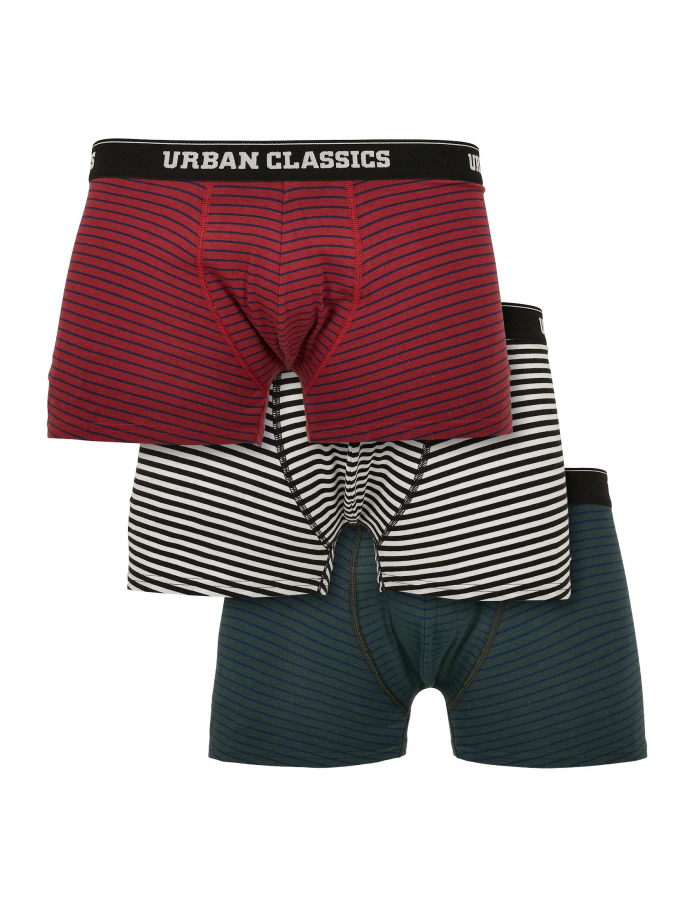 Někdy prostě musí být pruhované: toto hodnotné trojbalení boxerek Urban Classics nabízí šikmé vodorovné pruhy v barevných variantách zelená, červená a černá a bílá. Všechny boxerky mají černý elastický pas s bílým logem Urban Classics. Měkký strečový žerzejový materiál zajišťuje pohodlné, těsně padnoucí spodní prádlo.