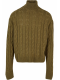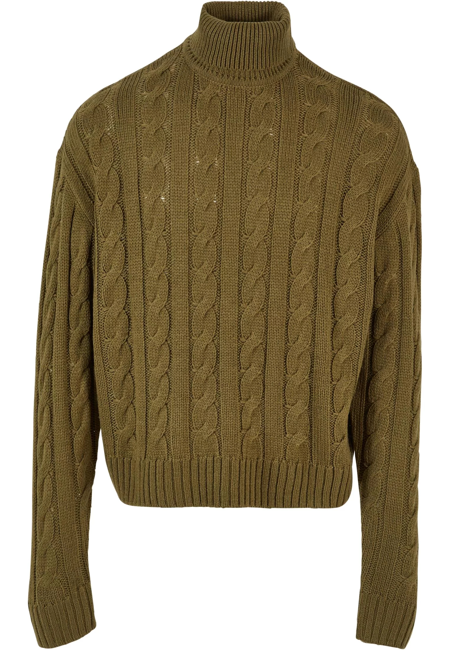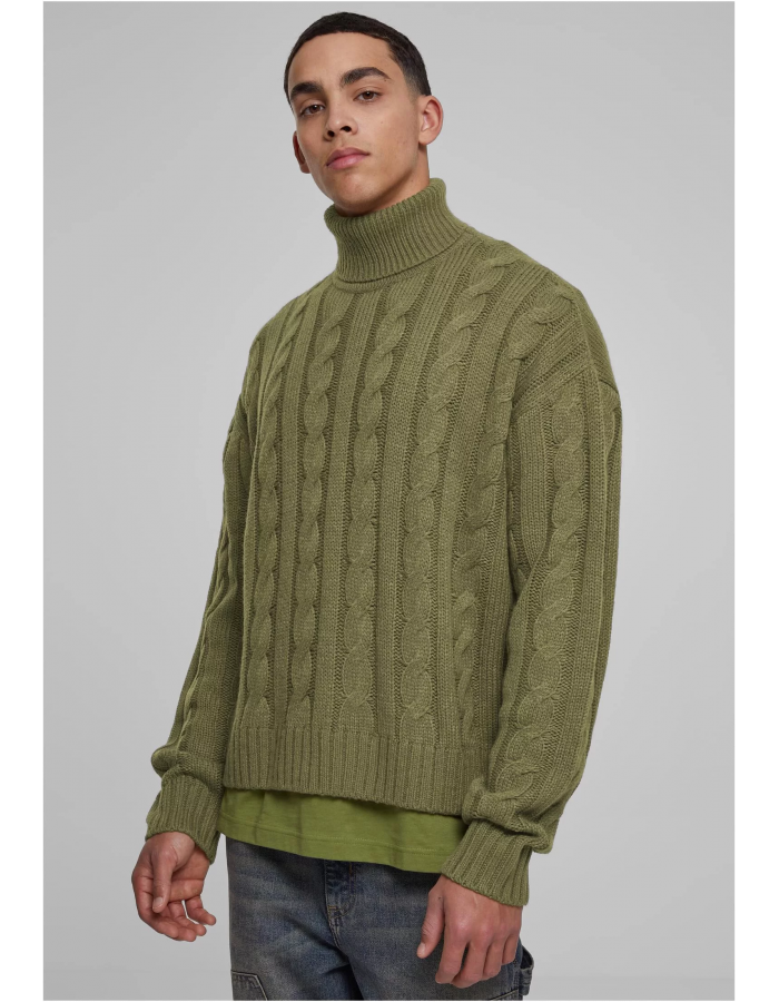 Pánský svetr má velký rolák a různé pletené vzory, které dodávají další akcenty. Rukávy a přední část mají svislý kabelový vzor, zatímco zadní část využívá hustý, souvislý úplet. Široké žebrované manžety na rukávech a lemu doplňují design. Pánský pletený svetr je vyroben z hladkého akrylu a má oversized střih se spadlými rameny.
