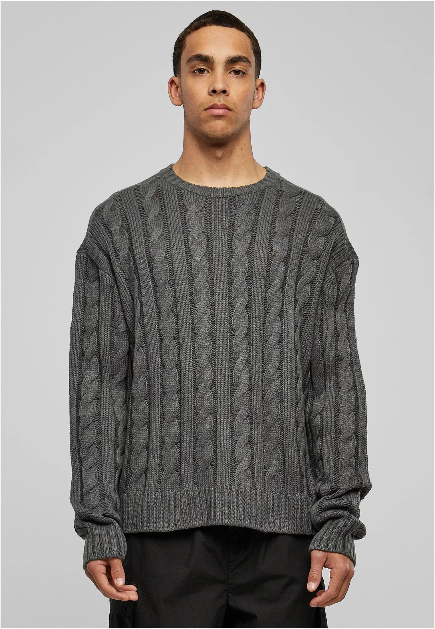 Tento elegantní, jednobarevný pánský pletený svetr má na přední straně a na rukávech velký kabelový vzor. Vzhled dotvářejí široké žebrované manžety na rukávech a lemu, stejně jako žebrovaný výstřih. Díky svému oversize / hranatému střihu s širokými spadajícími rameny je svetr pramenem pohody. Je vyrobena z hladké akrylové tkaniny.