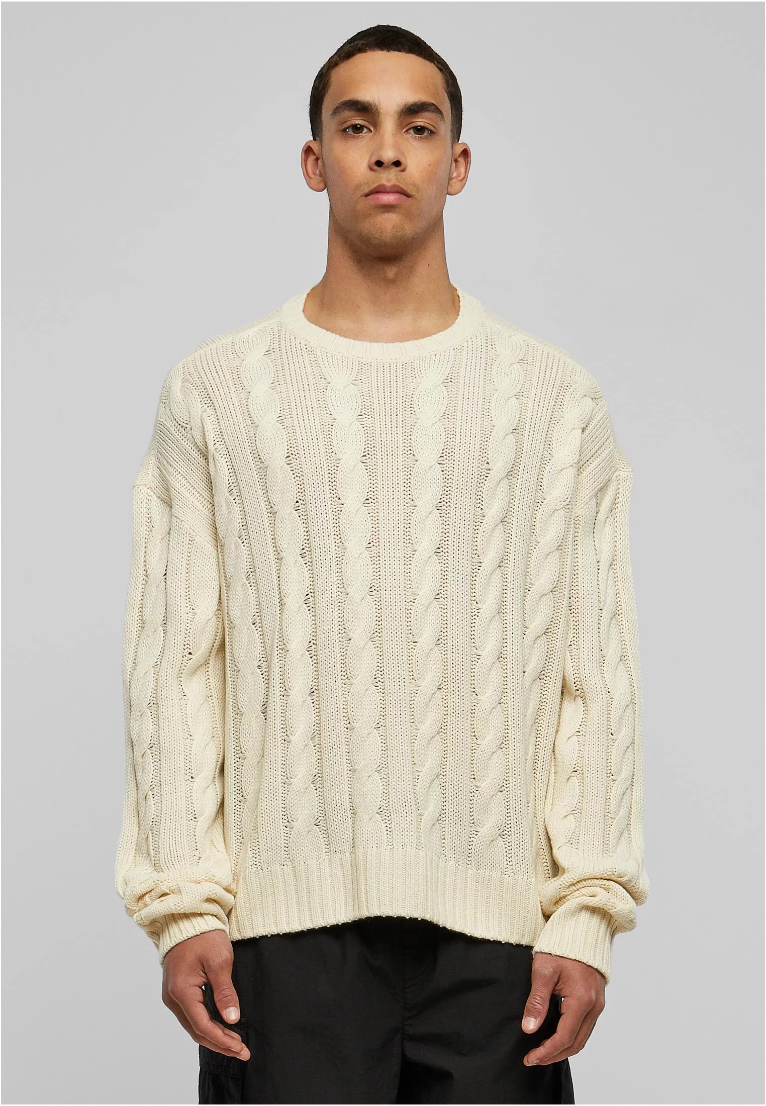 Tento elegantní, jednobarevný pánský pletený svetr má na přední straně a na rukávech velký kabelový vzor. Vzhled dotvářejí široké žebrované manžety na rukávech a lemu, stejně jako žebrovaný výstřih. Díky svému oversize / hranatému střihu s širokými spadajícími rameny je svetr pramenem pohody. Je vyrobena z hladké akrylové tkaniny.