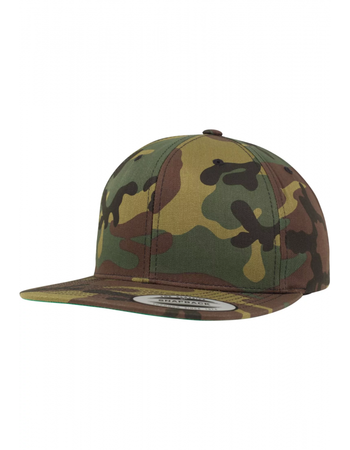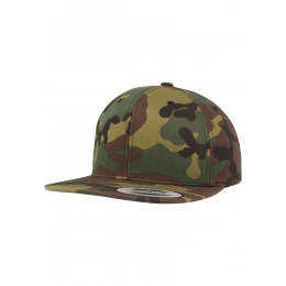 Vysoce kvalitní potisk Woodland Camo Print. Klasický tvar. Černá plastová spona. Tvrdý buckram. Klasický zelený podhled.