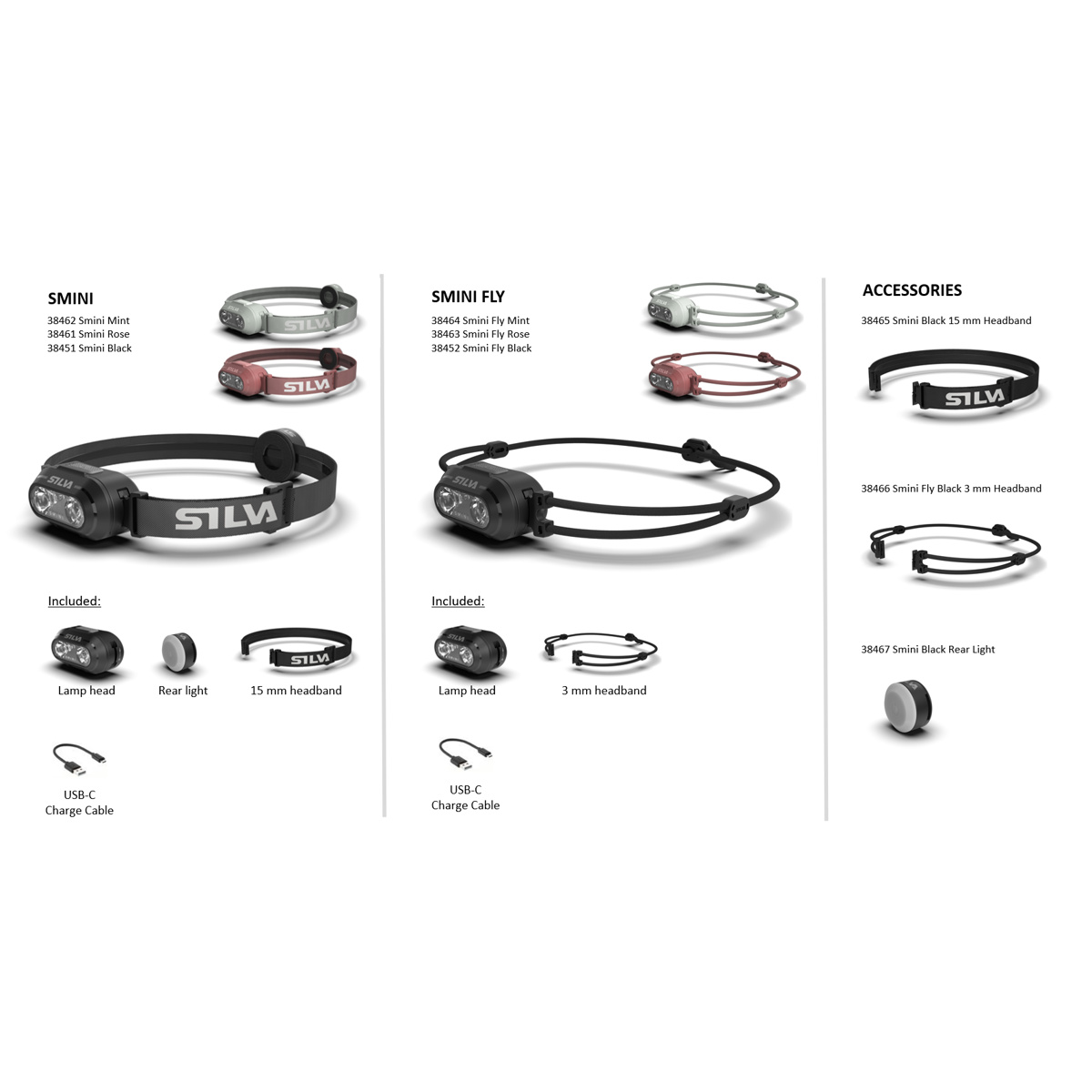 SILVASmini s výkonem 250lm při hmotnosti pouhých 53g, je všestranná čelovka s využitím na kratší výběhy, jako záloha k hlavní čelovce na delší závody, ale také na lehčí turistiku. Tři intenzity bílých LED a jedna intenzita červené LED v hlavním reflektoru. Na 15 mm široké čelence, je zadní odnímatelné červené bezpečnostní světlo / blikačka, s integrovanou Li-Ion baterií, nabíjecí přes USB-C. V hlavním reflektoru je integrovaná Li-Ion 2,5Wh nabíjecí USB-C baterie. Voděodolnost IPX5 - stříkající voda ze všech stran. Čtyři diody indikují úroveň nabití a stav zamknutí tlačítka proti nechtěnému zapnutí čelovky, např. v batohu. Technologie Intelligent Light zajišťuje rovnoměrný rozptyl světla do dálky i do stran. Elastická čelenka je vyměnitelná, za odlehčenou 3 mm variantu - 38466.