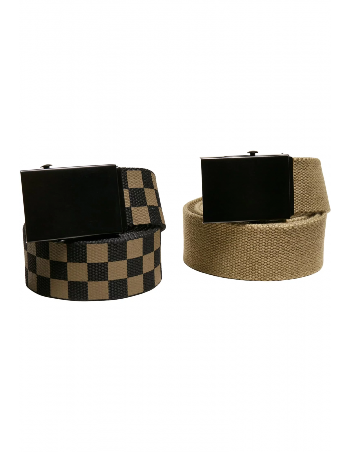 Sada dvou plátěných pásů obsahuje jeden jednobarevný pás a jeden pás s průběžným šachovnicovým vzorem. Pásy jsou vyrobeny z pevného polyesteru a jsou 3,8 cm široké a 115 / 135 cm dlouhé. Zapínají se pohybem zápěstí pomocí kovové spony.