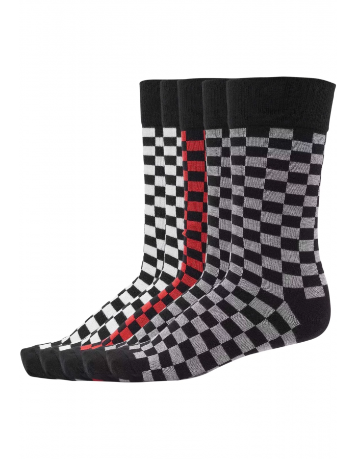Pohodlné unisex ponožky pro sport a volný čas: sada ponožek pět v jednom má nápadný šachovnicový vzor ve třech různých barvách. Oblast prstů i elastické manžety jsou drženy v kontrastní barvě. Materiál unisex ponožek je bavlna s malým podílem elastanu a polyesteru, slibuje tak skvělý komfort nošení a zaručuje přesné padnutí. Ponožky jsou střiženy vysoko po lýtka.