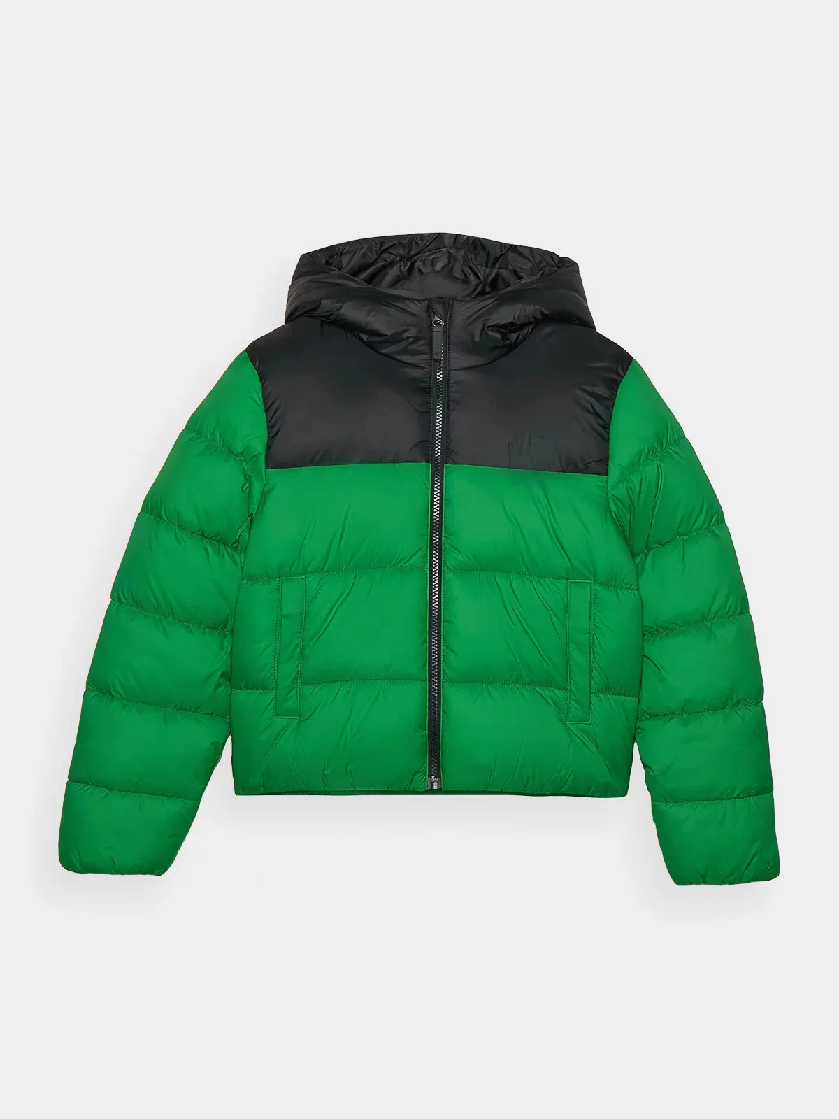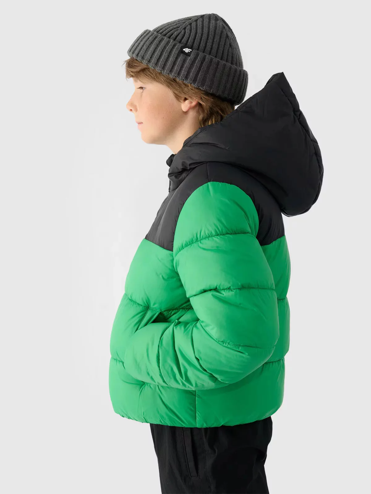 Chlapecká péřová bunda se zapíná na jednosměrný hlavní zip a je vybavená vnitřní větruodolnou légou, která omezuje pronikání chladu dovnitř bundy.