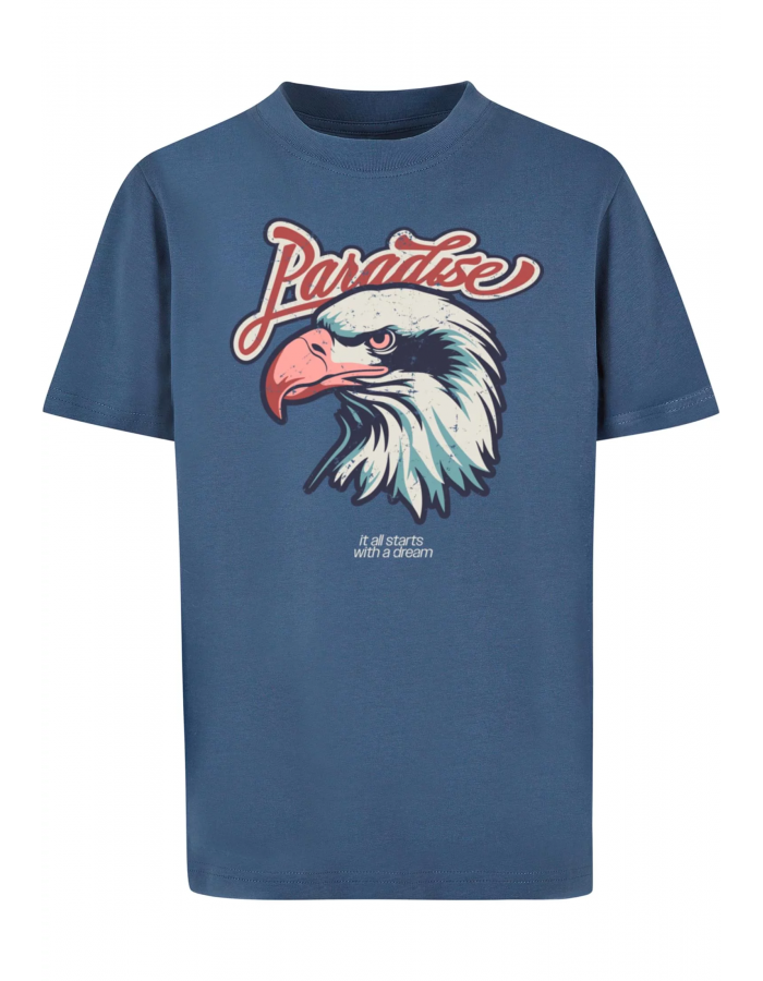 Toto tričko s krátkým rukávem má výrazný grafický design s motivem hlavy orla na přední straně. Nad obrázkem je napsáno „Paradise“ ve výrazném stylu písma, zatímco pod orlem je menší nápis „it all starts with a dream“. Tričko má klasický kulatý výstřih a jednoduchý střih, což zajišťuje pohodlí pro každodenní nošení. Tento design je inspirován volností a snem, což z něj dělá skvělý kousek pro ty, kteří mají rádi symboliku síly a svobody.