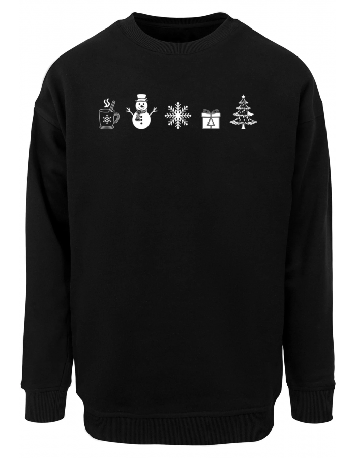 Na hrudi je decentní potisk s vánočními motivy – hrnek s punčem, sněhulák, vločka, dárek a stromeček – který dodává mikině hravý a zimní charakter.